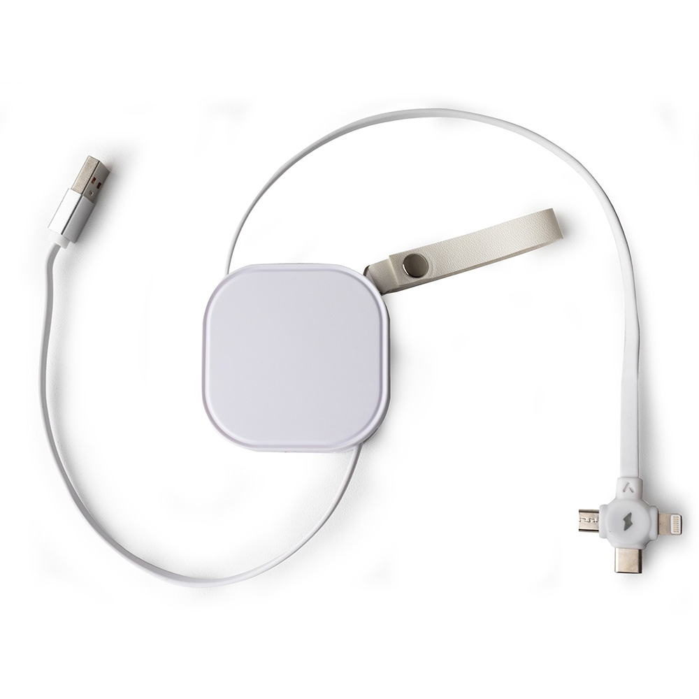 Cabo USB retrátil com suporte para celular. Contém entradas Lightning/iPhone, V8/Android, Tipo-C/Android e 4 diferentes ajustes do comprimentos dos cabos. Suporte de frente lisa e com alça para transporte em couro sintético.