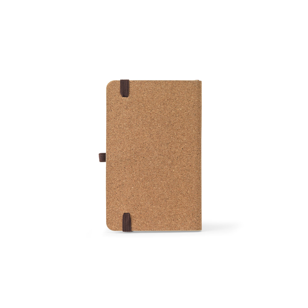Caderno de bolso de capa dura em folha de bambu e cortiça. Contém 160 páginas, em papel 100% reciclado, pautadas cor de marfim, fita separadora, suporte para esferográfica (não inclusa) e elástico para fecho do caderno. 90 x 142 mm