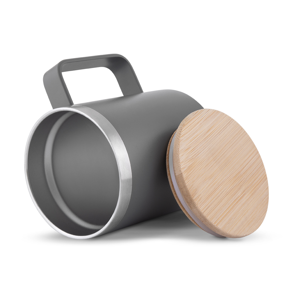 Caneca térmica 400ml, produzida em inox reciclado (304 interno / 201 externo), com tampa em bambu, pintura a pó.