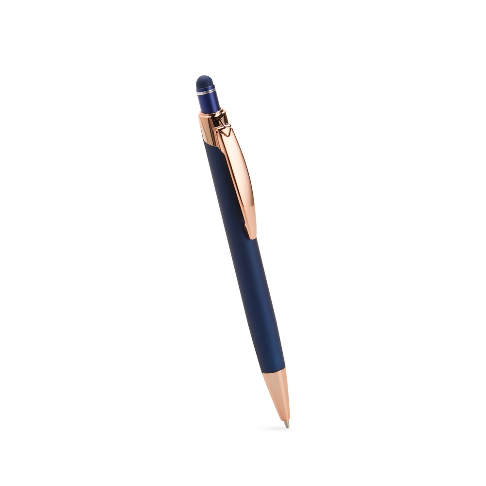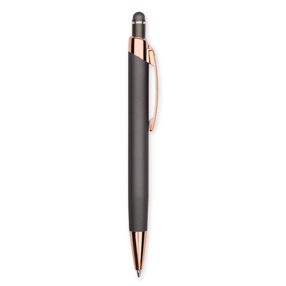 Descrição: Caneta metálica com carga esferográfica azul de 1,0mm e acionamento por clique de revestimento emborrachado para interação em dispositivos com telas sensíveis ao toque.