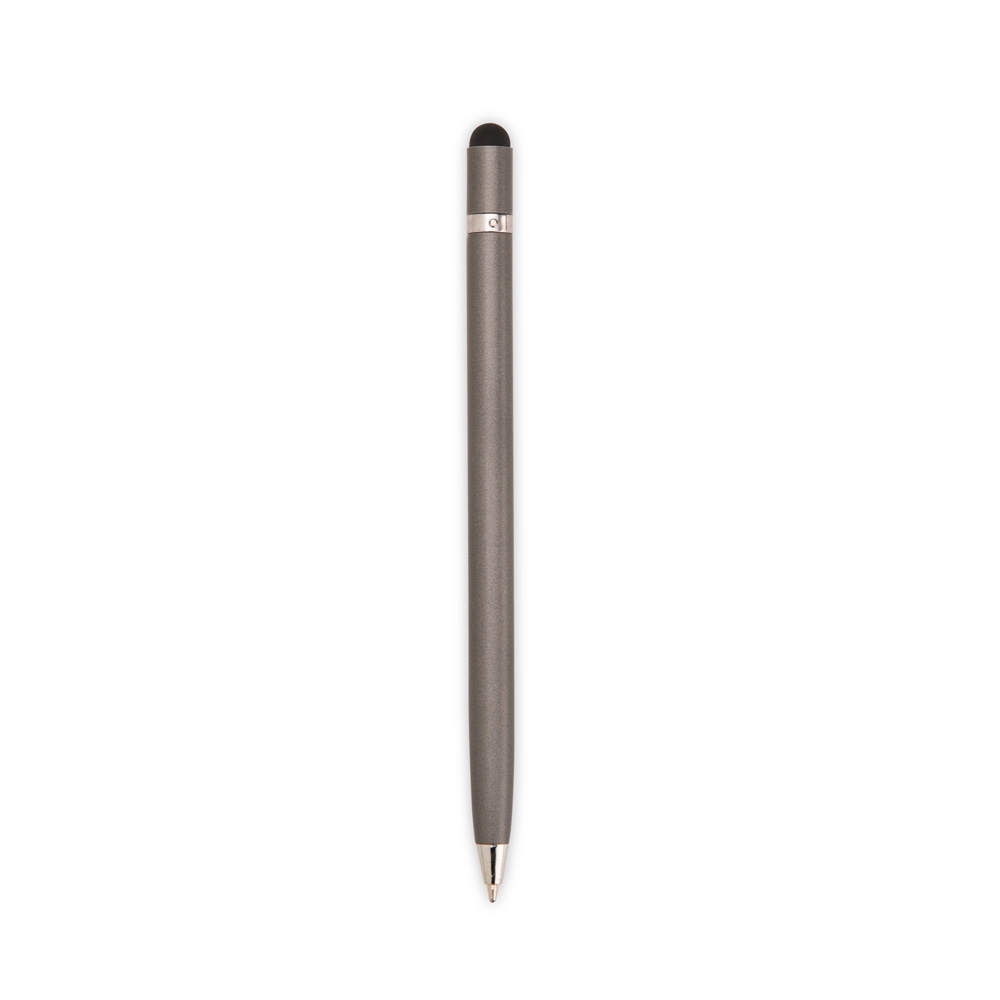 Descrição: Caneta metálica com detalhe emborrachado no topo, ideal para uso em dispositivos com telas sensíveis ao toque. Possui acionamento por rotação e carga esferográfica azul de 1,0mm.
