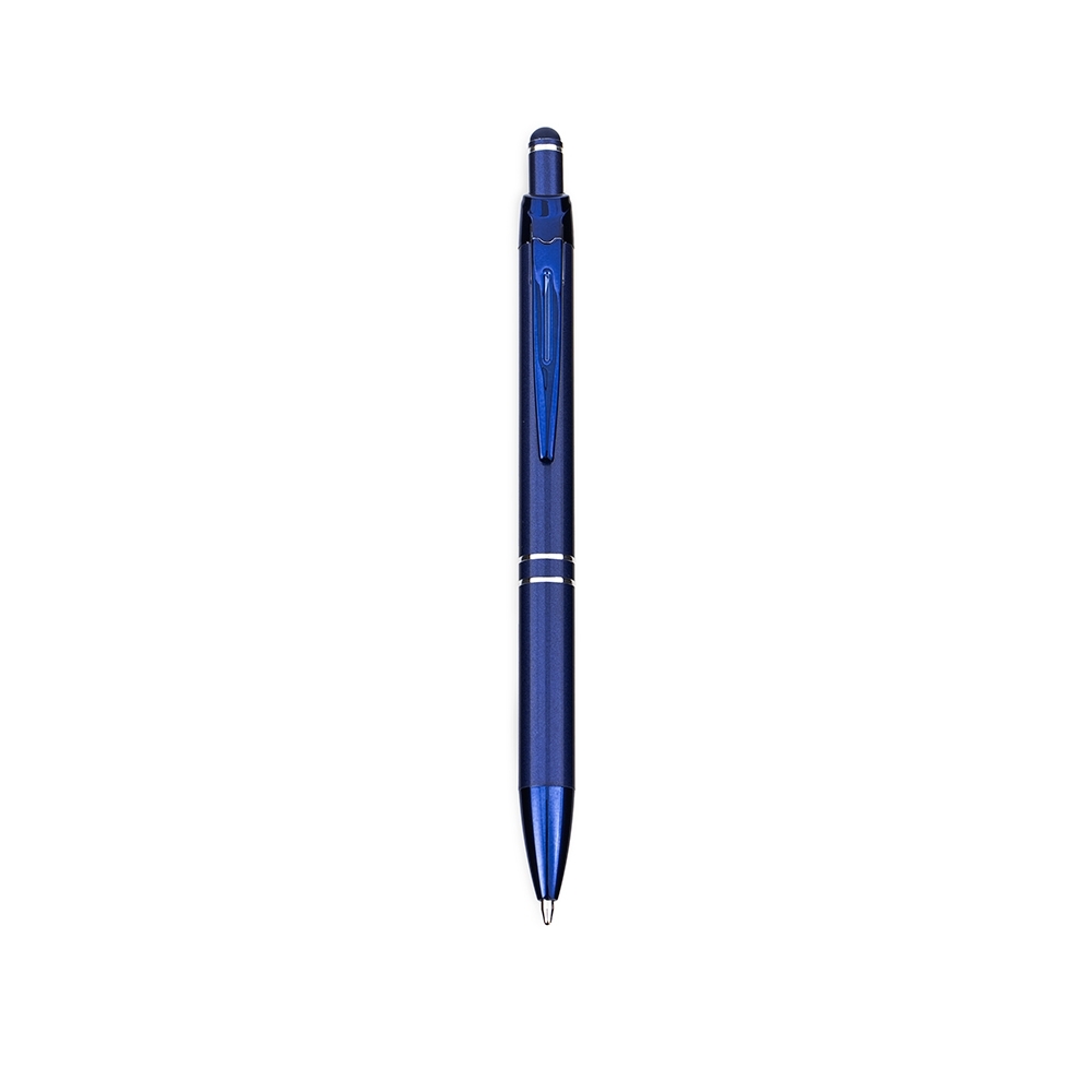 Descrição: Caneta em metal com clip e ponta em plástico, além de detalhe emborrachado no topo para interação com dispositivos de telas sensíveis ao toque. Conta com acionamento por clique e carga esferográfica azul de 1,0mm.