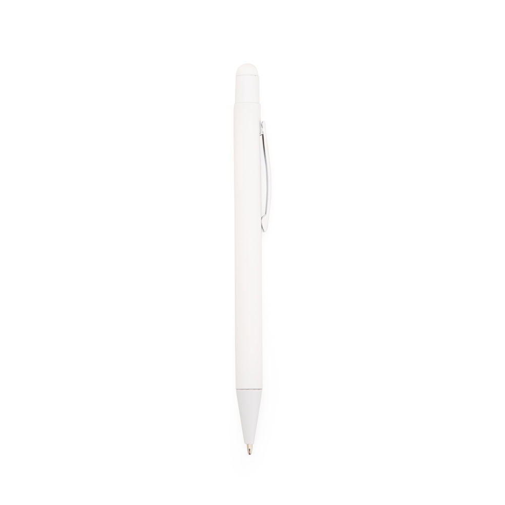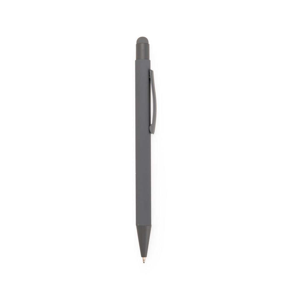 Descrição: Caneta metálica com pintura de acabamento emborrachado. Possui acionamento por clique com detalhe emborrachado no topo para interação com dispositivos com telas sensíveis ao toque, além de carga esferográfica azul de 1,0mm.