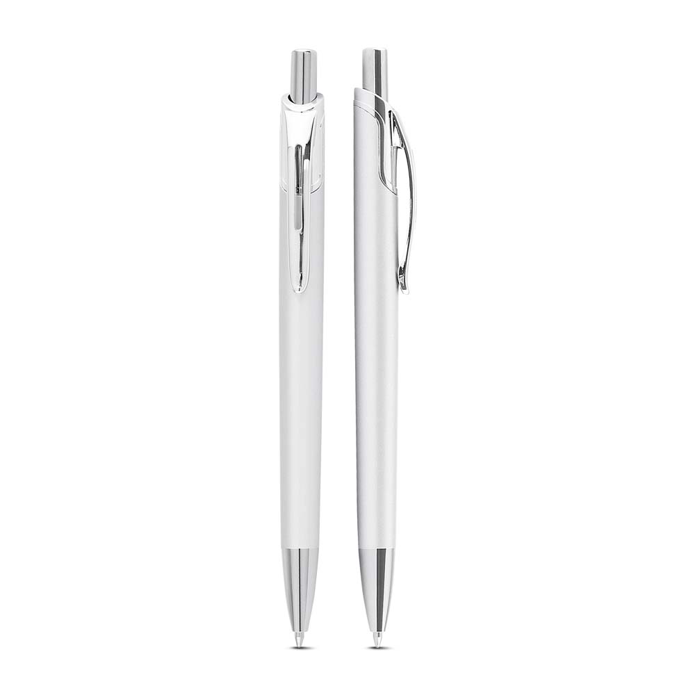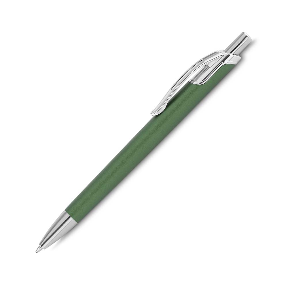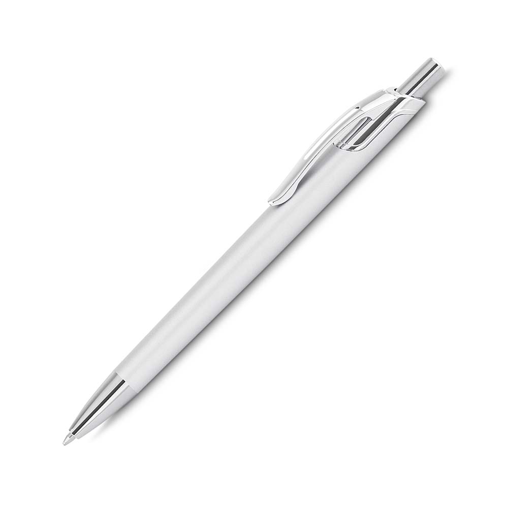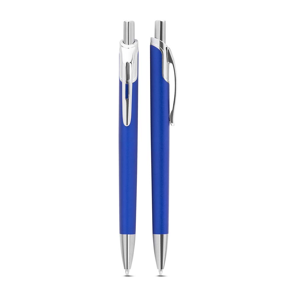 Caneta com corpo em alumínio reciclado, acionador e clipe cromado, escrita esferográfica em azul.