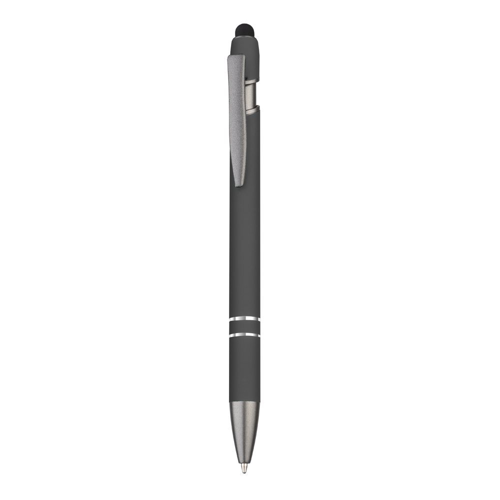 Caneta esferográfica em metal escrita em azul com cor fosca. Refil tipo parker com ponta touch emborrachada e detalhe cromado.