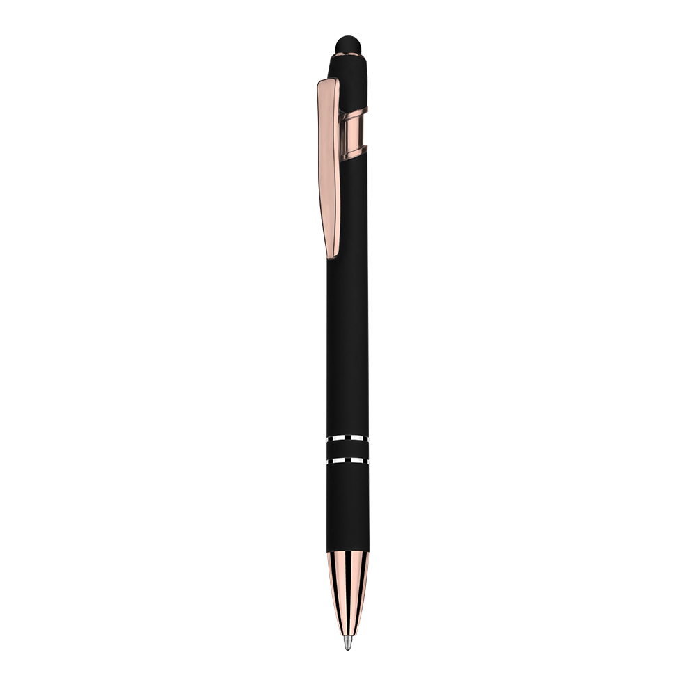 Caneta esferográfica em metal escrita em azul com cor fosca. Refil tipo parker com ponta touch emborrachada e detalhe dourado.