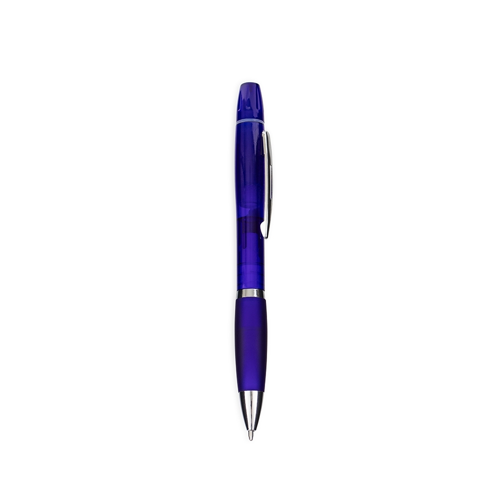 Descrição: Caneta plástica com marca-texto e tampa protetora localizados no topo. Possui clip e ponteira em metal, acionamento por rotação e ponta esferográfica azul de 1.0mm.