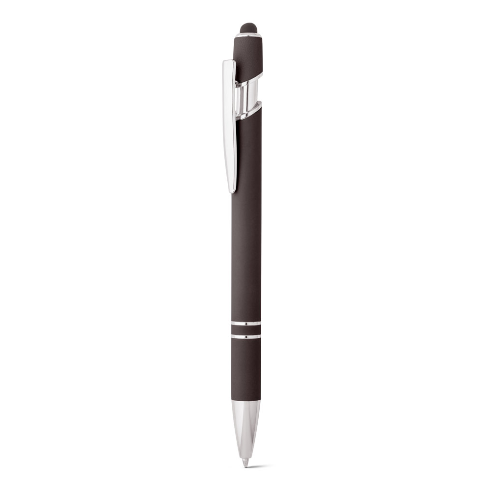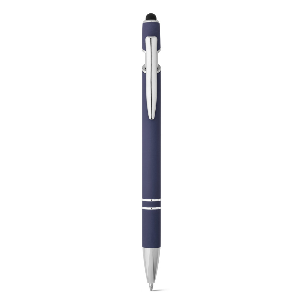 Esferográfica em alumínio com acabamento emborrachado. A esferográfica tem escrita em azul, ponteira touch no topo da esferográfica e clipe de metal. ø10 x 143 mm
