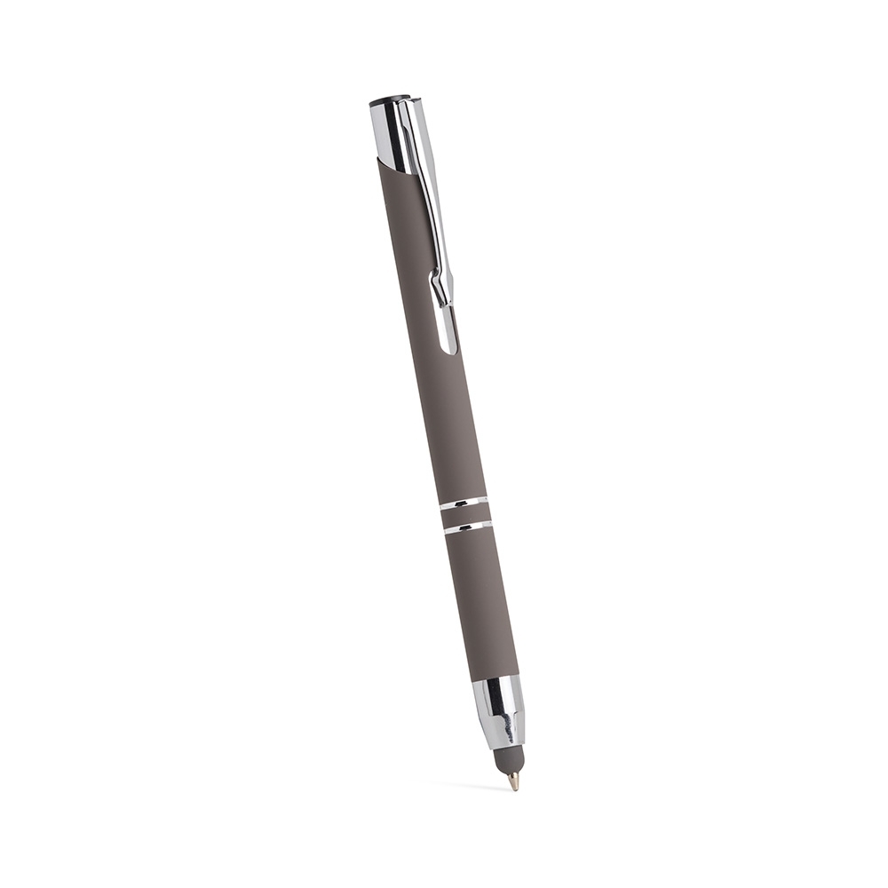 Descrição: Caneta esferográfica com carga azul de 1.0mm e acionamento por clique. De construção metálica, também possui ponteira emborrachada que permite seu uso como uma caneta touch para interação com dispositivos de tela sensível ao toque.