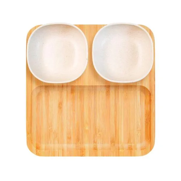 Conjunto para petiscos e patês em Bambu/Fibra de bambu. Acompanha dois potes em fibra de bambu, base e duas espátulas de 14cm em bambu.