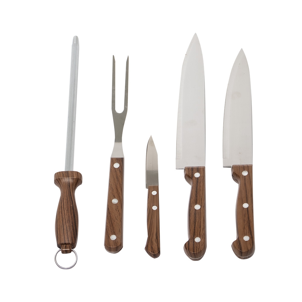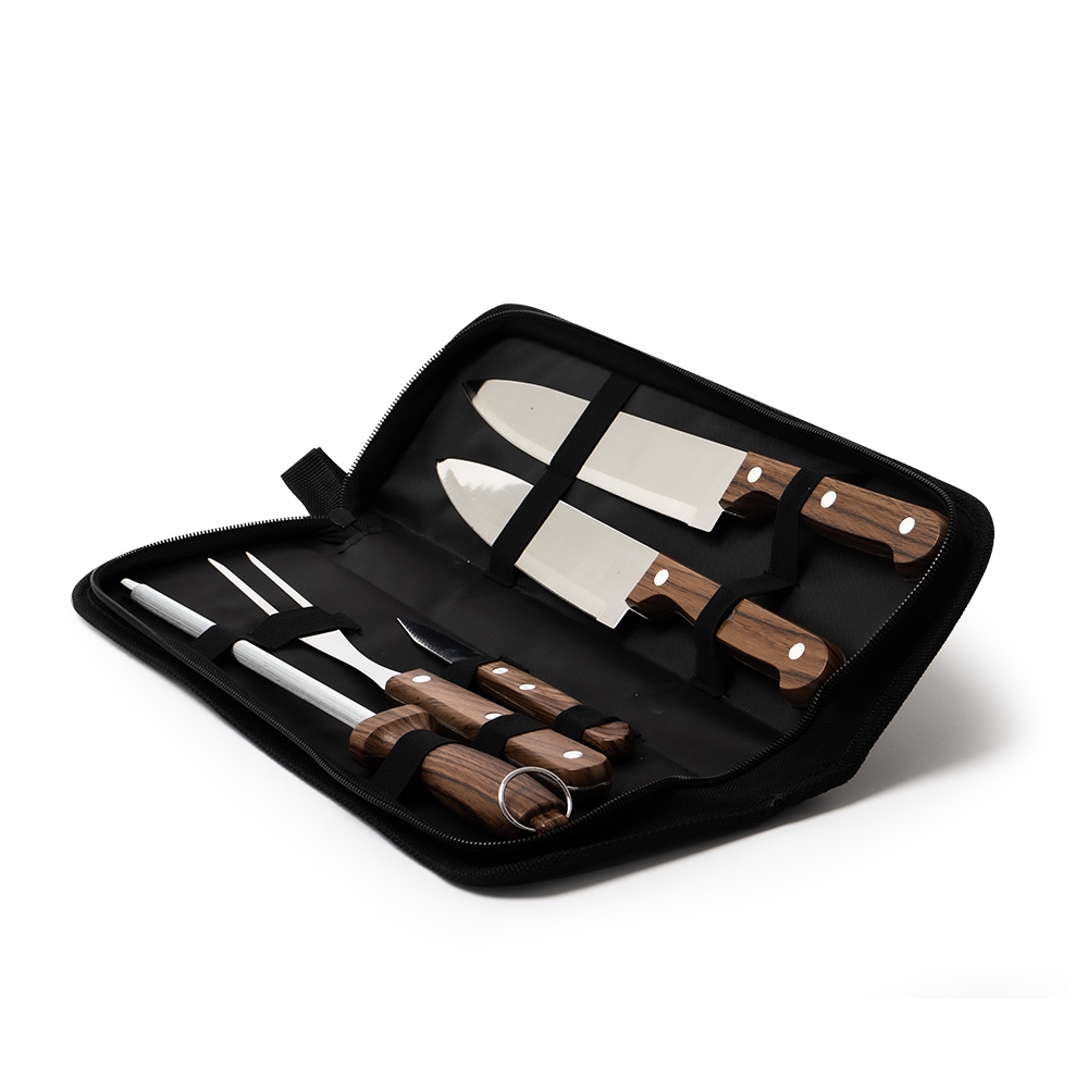 Descrição: O kit perfeito para os verdadeiros amantes de churrasco! Composto por 5 peças em inox com pegas de madeira, nosso kit inclui três facas, sendo de 7”, 6” e 3” polegadas, além de um garfo e uma chaira, todos acomodados em um prático estojo de nylon, ideal para transportar facilmente para qualquer lugar.