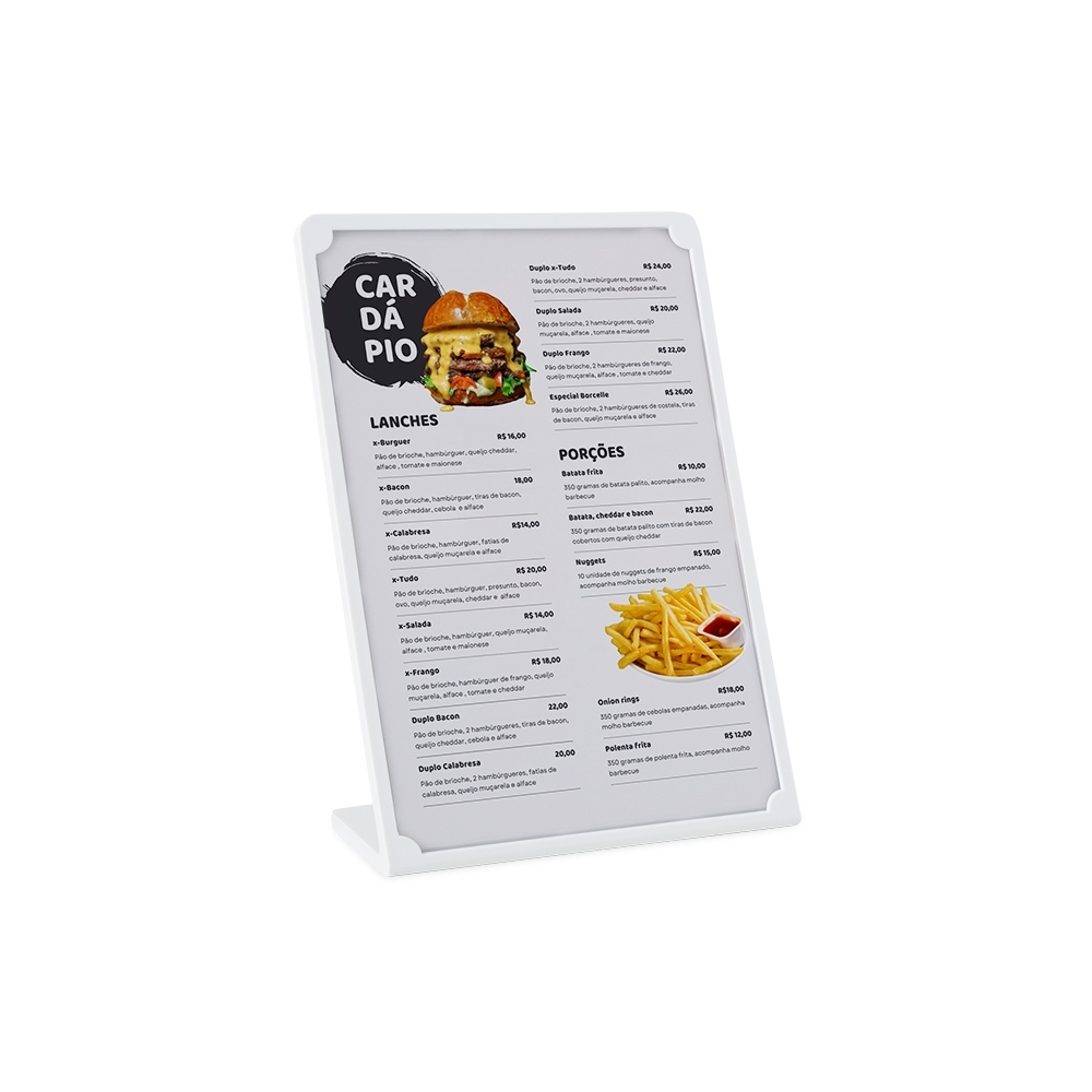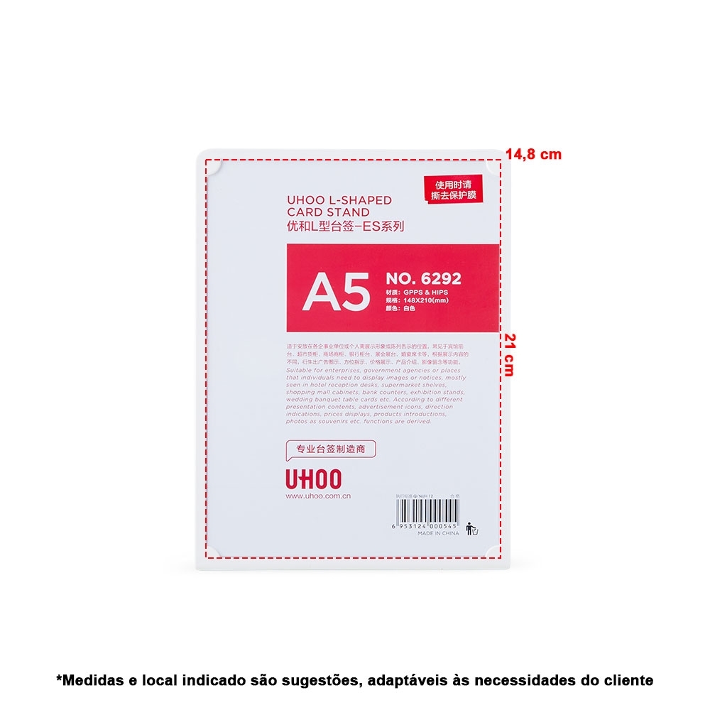 Descrição: Expositor porta retrato A5 feito em poliestireno com placa acrílica.