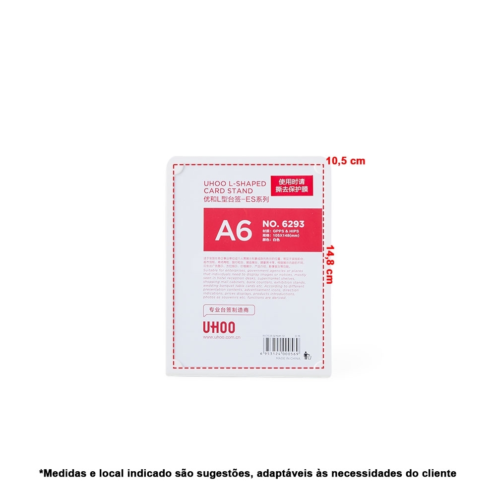Descrição: Expositor porta retrato A6 feito em poliestireno com placa acrílica.