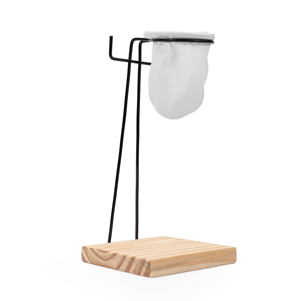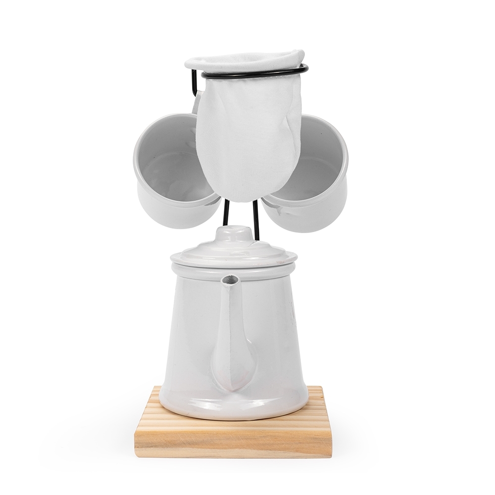 Descrição: Um kit completo para preparar um café de forma especial em qualquer ocasião. O conjunto contém: 1 bule em alumínio com capacidade de 300ml, 2 xícaras em alumínio de 90ml cada e 1 coador em tecido com suporte de metal e base em madeira.