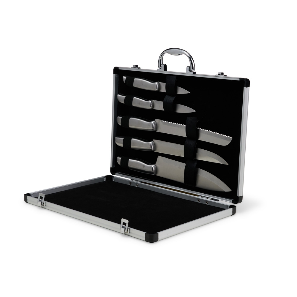Descrição: A solução ideal para quem valoriza qualidade nos cortes e organização na cozinha. O kit inclui 5 facas em aço inoxidável, com diferentes tamanhos, perfeitas para uma experiência gourmet. Acompanha uma maleta de alumínio texturizado, com interior revestido de veludo e duas travas que garantem maior segurança. Além disso, a maleta oferece espaço para personalização, tornando o kit ainda mais exclusivo.