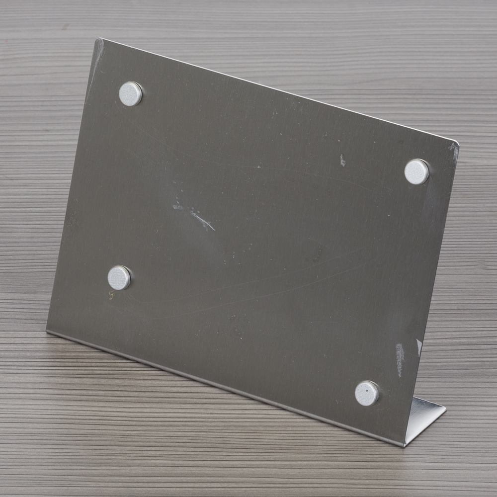 Descrição: Porta retrato 10 x 15 em inox escovado, modelo chapa metálica acompanha quatro “botões” imã e película protetora anti-risco.