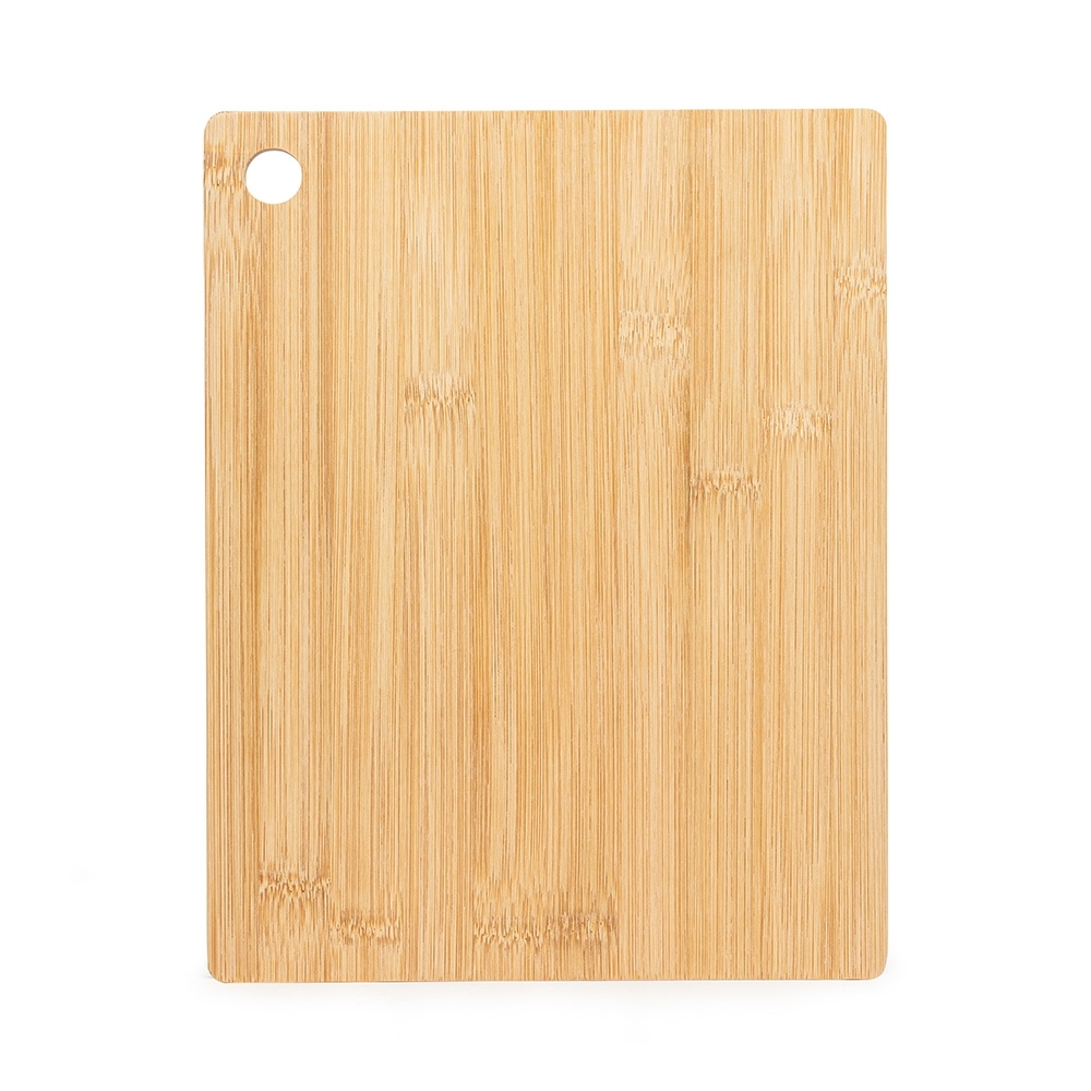 Descrição: Tábua de corte de bambu com canaleta e acesso para gancho.