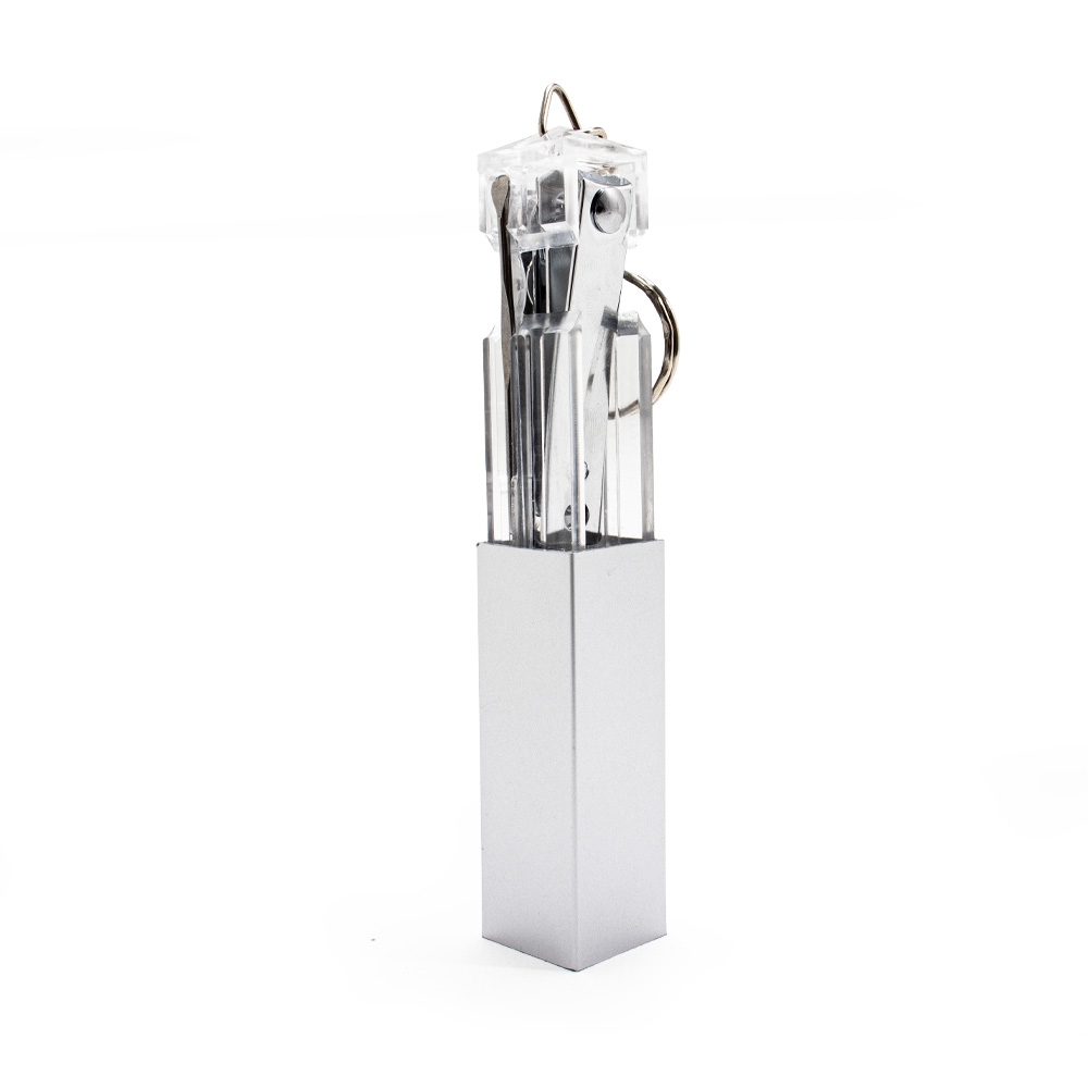 Descrição: Chaveiro kit manicure 4 peças em estojo plástico. Possui lixa, pinça, empurrador de cutícula e cortador de unha preso. Estojo com berço plástico para acomodação das peças.