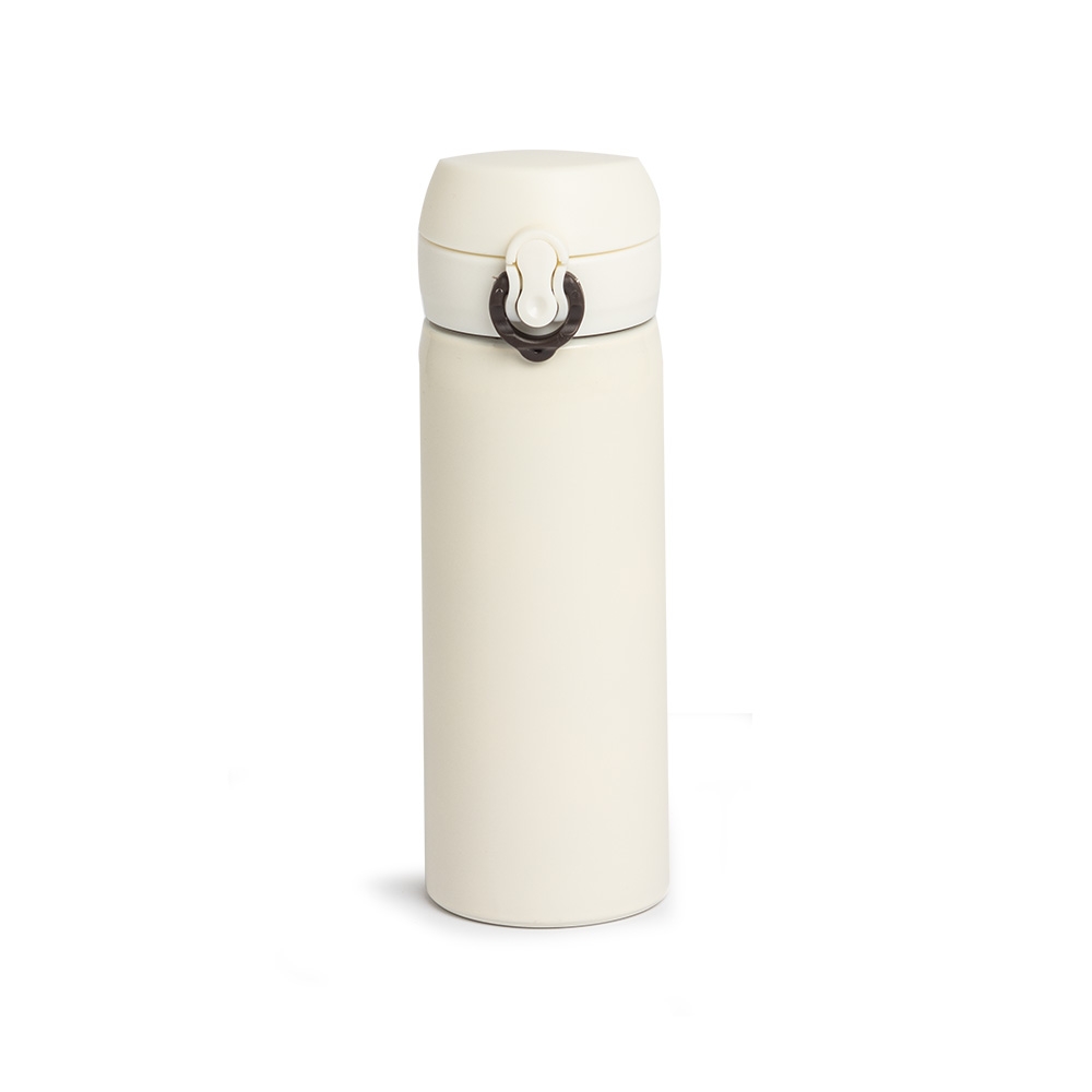 Descrição: Garrafa 500ml em inox com botão e válvula para abertura. Possui um sistema de trava (basta mover para cima/baixo para abrir/fechar) pressione o botão central para abrir a tampa.