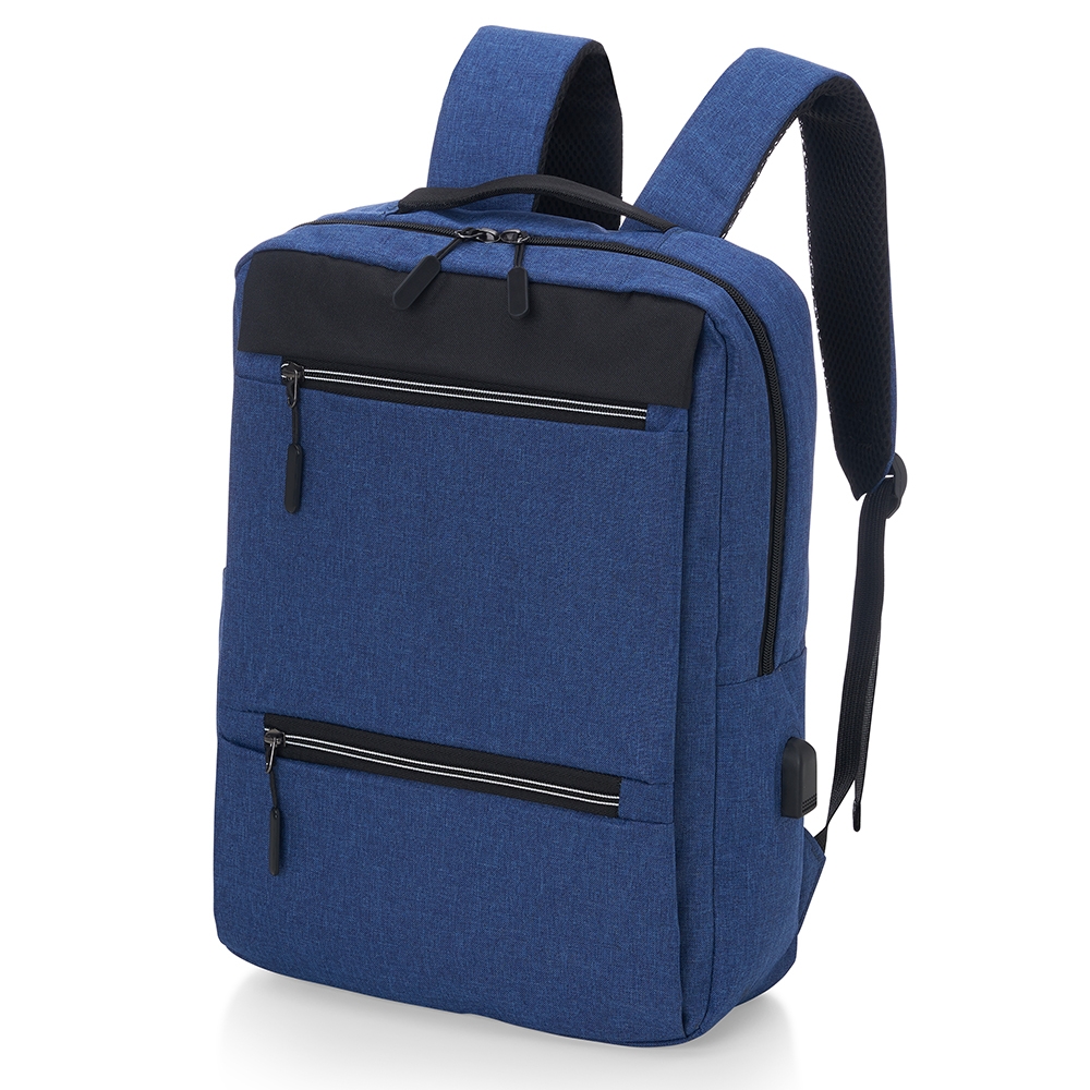 Mochila confeccionada em nylon com compartimento para notebook até 15,6 polegadas. Contém compartimento grande com divisórias para documentos, eletrônicos e caneta, dois compartimentos frontais com abertura horizontal, bolso lateral e adaptador USB externo com cabo acoplado, permitindo a conexão de um carregador portátil de dentro da mochila e transferência da carga para o lado externo, ocultando o carregador e viabilizando a utilização do celular durante o processo. Contém zíperes com pegadores plásticos, alça de mão em nylon e alças para as costas ajustáveis com revestimento espumado antitranspirante.