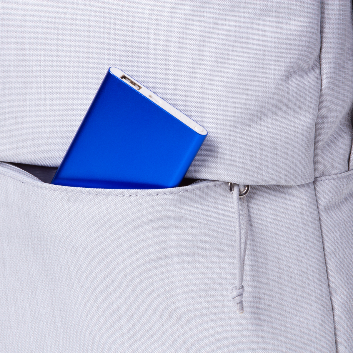 Compartimento frontal com fecho em zíper com cordão, com organizador interno para duas canetas e outros objetos.