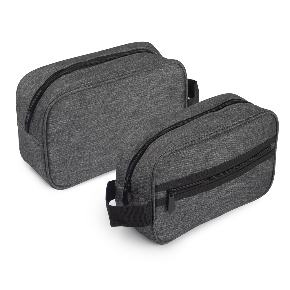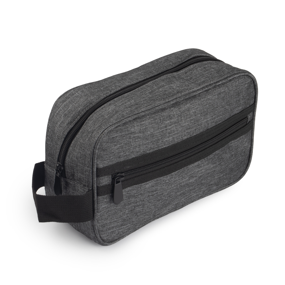 Necessarie em tecido poliéster, alça de mão e bolso externo com zíper.