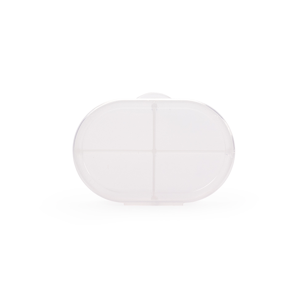 Descrição: Um porta-comprimidos compacto feito em plástico. Possui quatro divisórias que oferecem mais possibilidades para organizar medicamentos ou pequenos objetos.