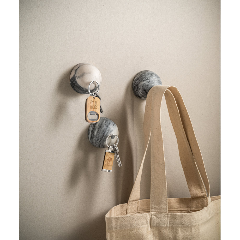 Chaveiro em aço inox e bambu com abridor de garrafas. A cor e o resultado da impressão nos materiais naturais pode variar entre produtos. 70 x 30 x 18 mm