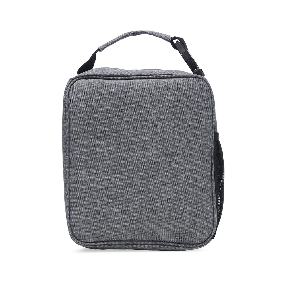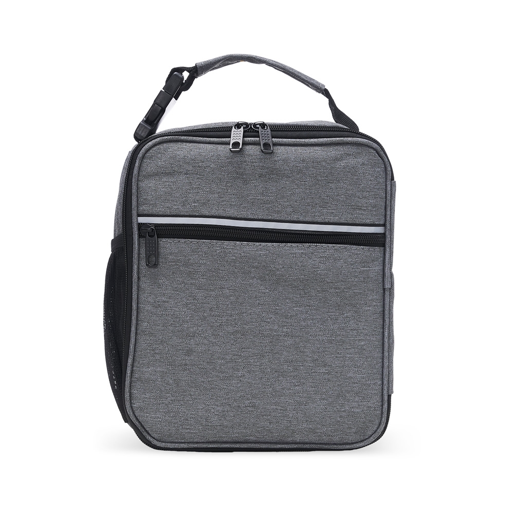 Descrição: Bolsa térmica de nylon com dois compartimentos, capacidade de 6 litros. Com bolso telado e tela média de proteção interna, a bolsa possui uma faixa frontal refletiva, bolso lateral telado e alça de mão com fivela de encaixe.
