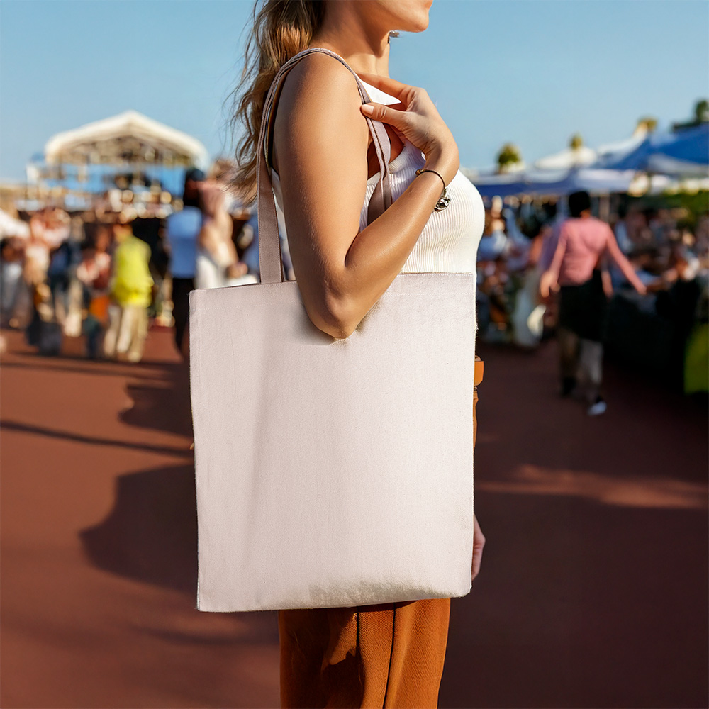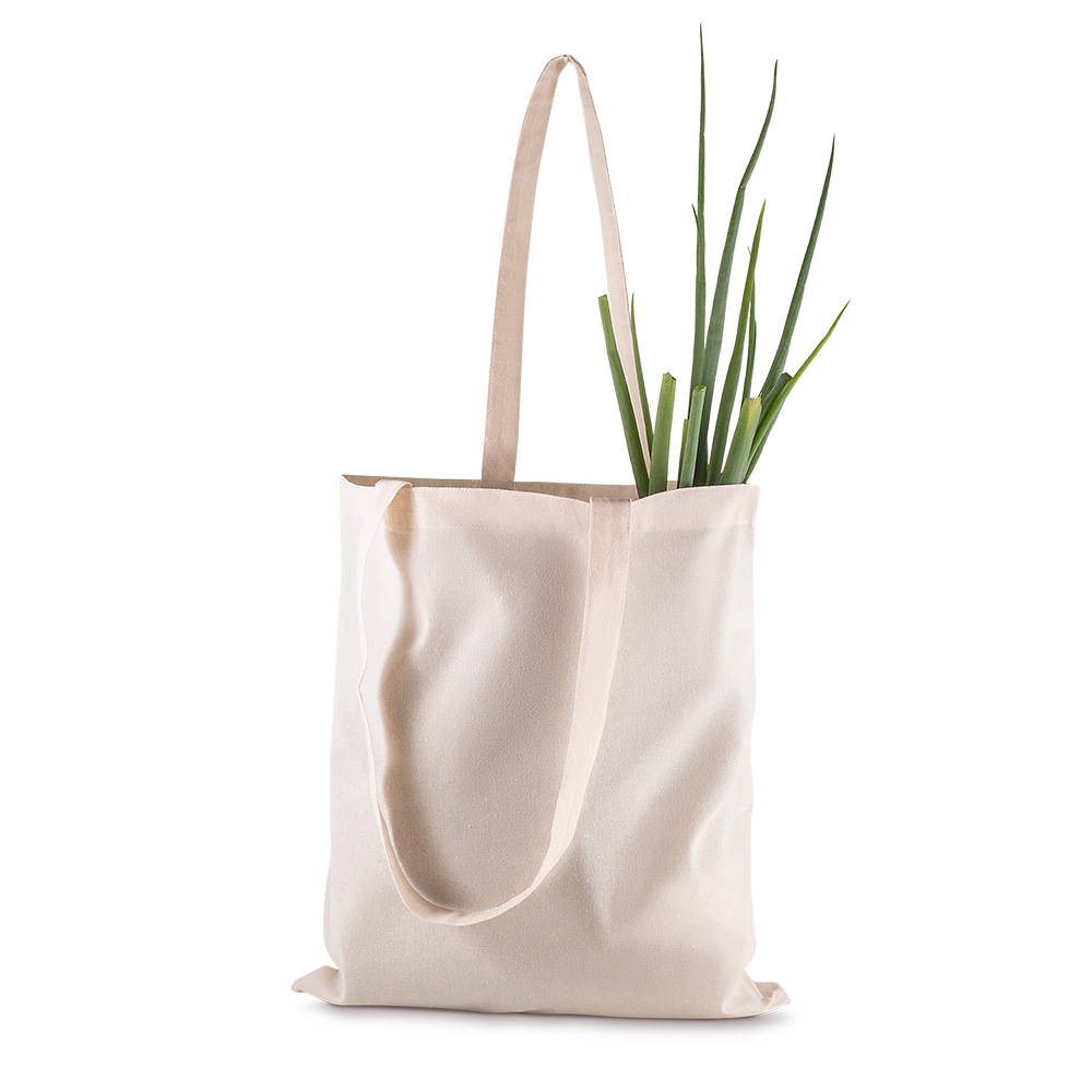 Sacola em Algodão Cru 140g/m². Alça com altura de 32 cm, ideal para transporte.