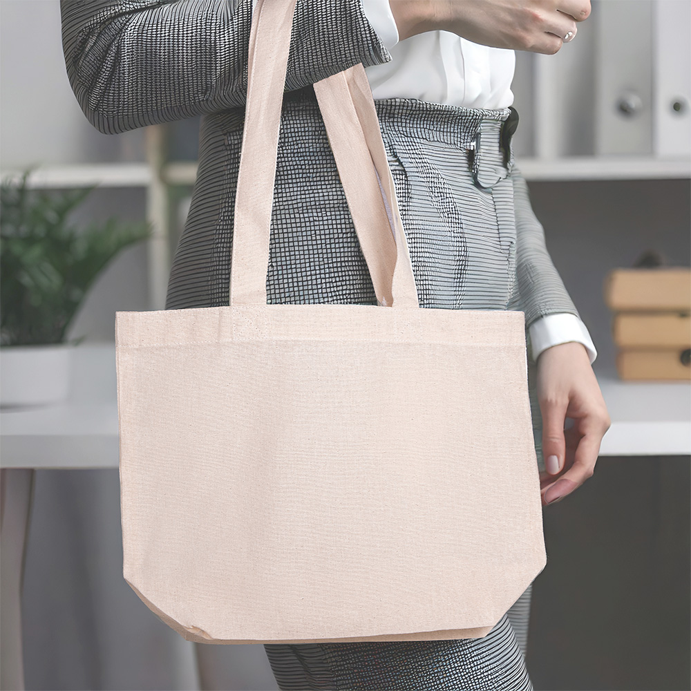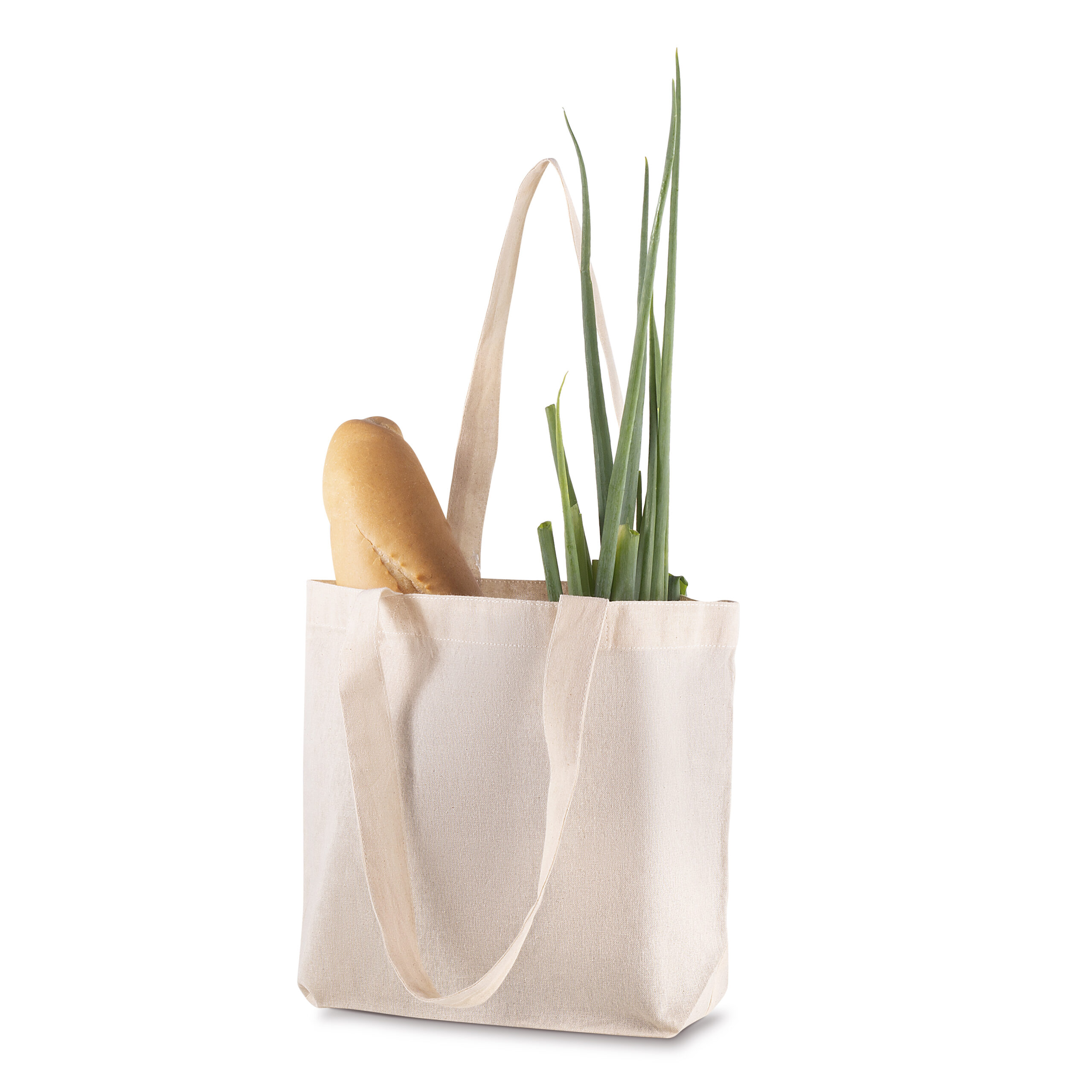 Sacola em Algodão Cru 120g/m²com base plana. Alça com altura de 23 cm, ideal para transporte.
