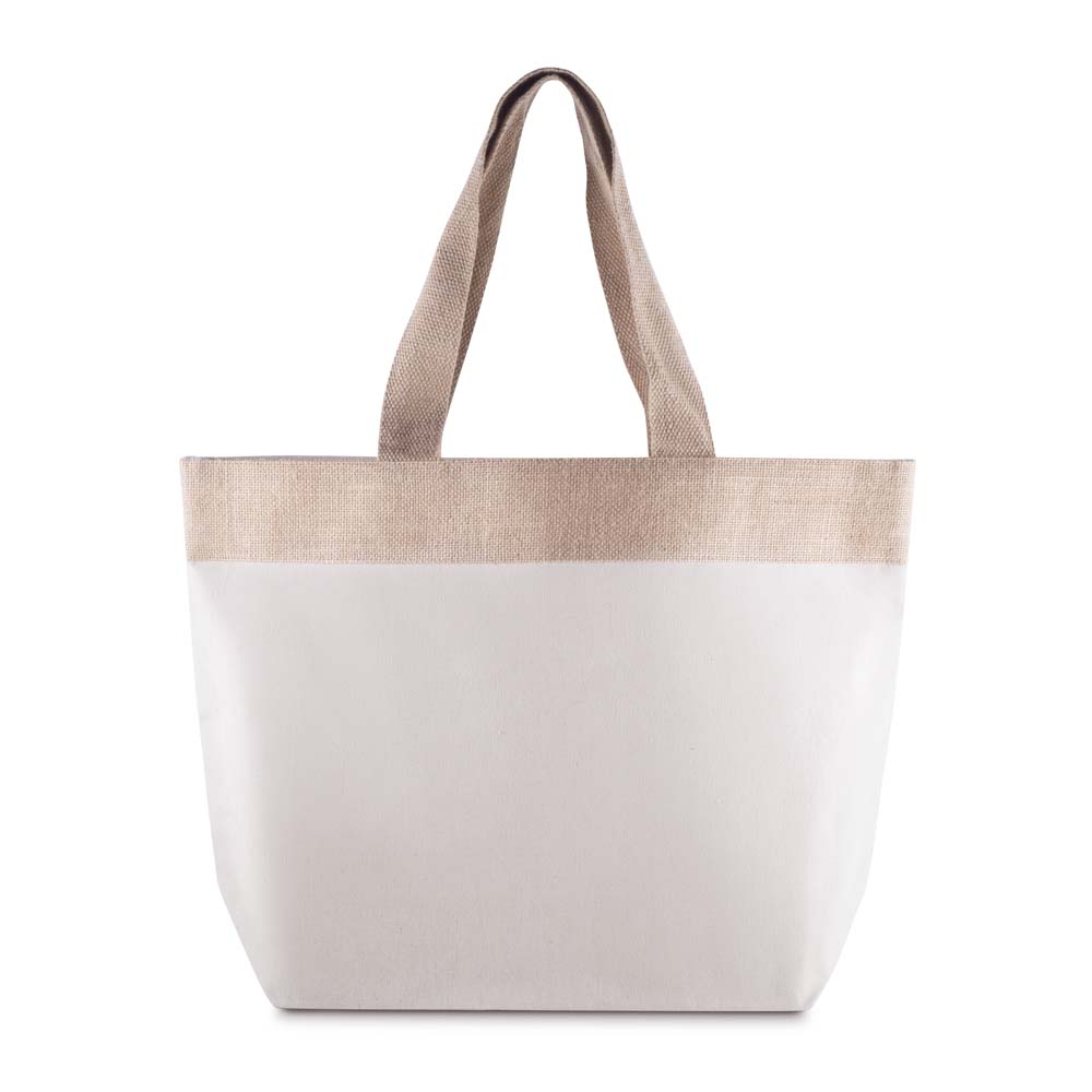 Sacola em Algodão Cru 220g/m² com detalhe em Juta. Alça com altura de 24 cm, ideal para transporte.