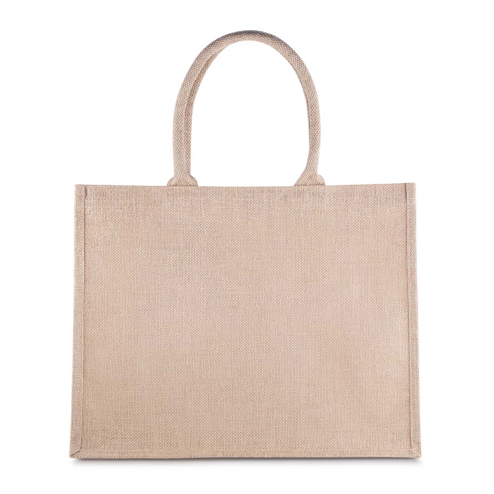Sacola de Juta 360g/m². Alças resistentes de Algodão Cru. Base plana para maior estabilidade, interior revestido em plástico PP. Alça com altura de 20 cm, ideal para transporte.