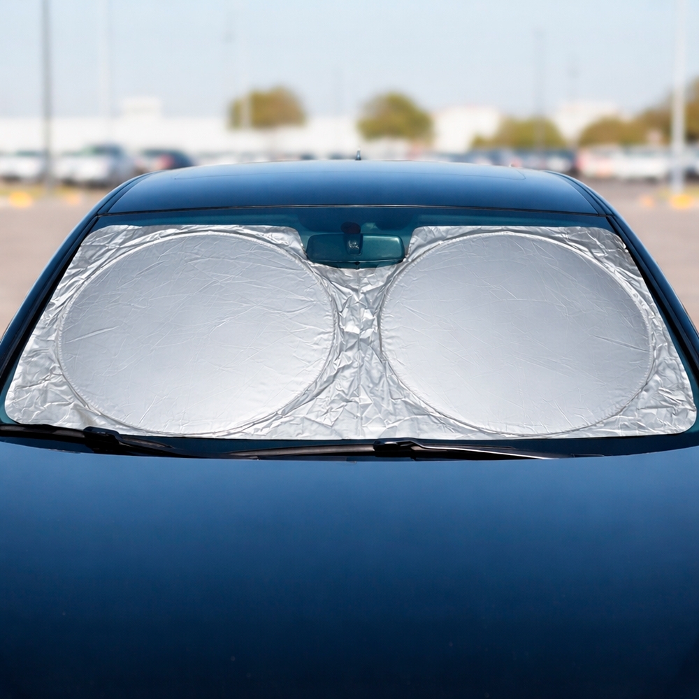 Descrição: Protetor solar dobrável para para-brisa, confeccionado em tecido leve e com estrutura flexível. Possui alça lateral elástica para facilitar o manuseio.