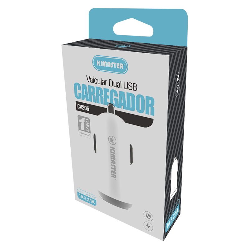 O carregador veicular Dual USB KIMASTER converte o acendedor 12V do seu veículo em uma fonte de alimentação 5V, podendo carregar até 2 aparelhos simultaneamente. Com design compacto, possui 2 saídas USB de 2.1A máx.