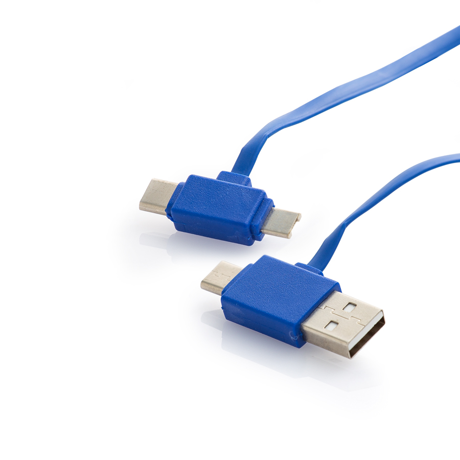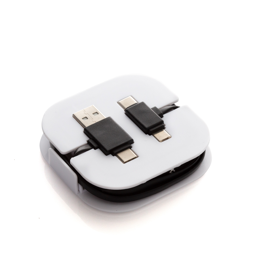Cabo carregador com conector USB e Tipo C. São quatro combinações de compatibilidade: micro usb /ios lightning/ tipo c/ tipo-c com tipo-c. De um lado adaptador tipo c e no outro lado adaptador que combina conexão micro usb em um lado, e uma conexão compatível com ios lightning no outro lado. Além disso, o conector tipo-c, permite a conexão tipo-c com tipo-c. Permite também transferência de dados entre seus dispositivos digitais. Seu estojo em material plástico, com tampa, que pode ser utilizada também como suporte para seu dispositivo digital. Disponível nas cores azul e preto. Medida da caixinha transparente 7cm x 7cm x 2cm. (14534)