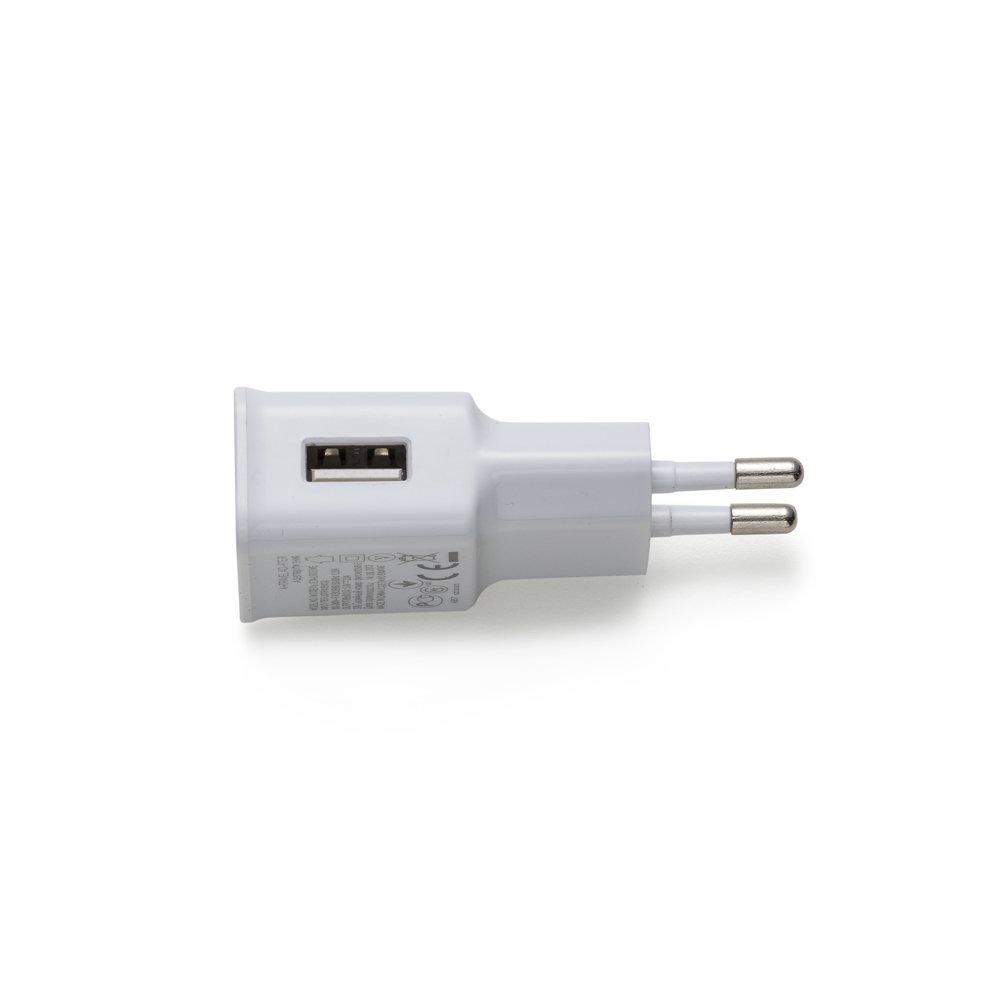 Descrição: Carregador tomada plástico branco. Para utilizar basta conectar cabo USB(não acompanha) no adaptador e ligar à energia, compatível com todos aparelhos. Parte frontal lisa e parte traseira com especificações técnicas.