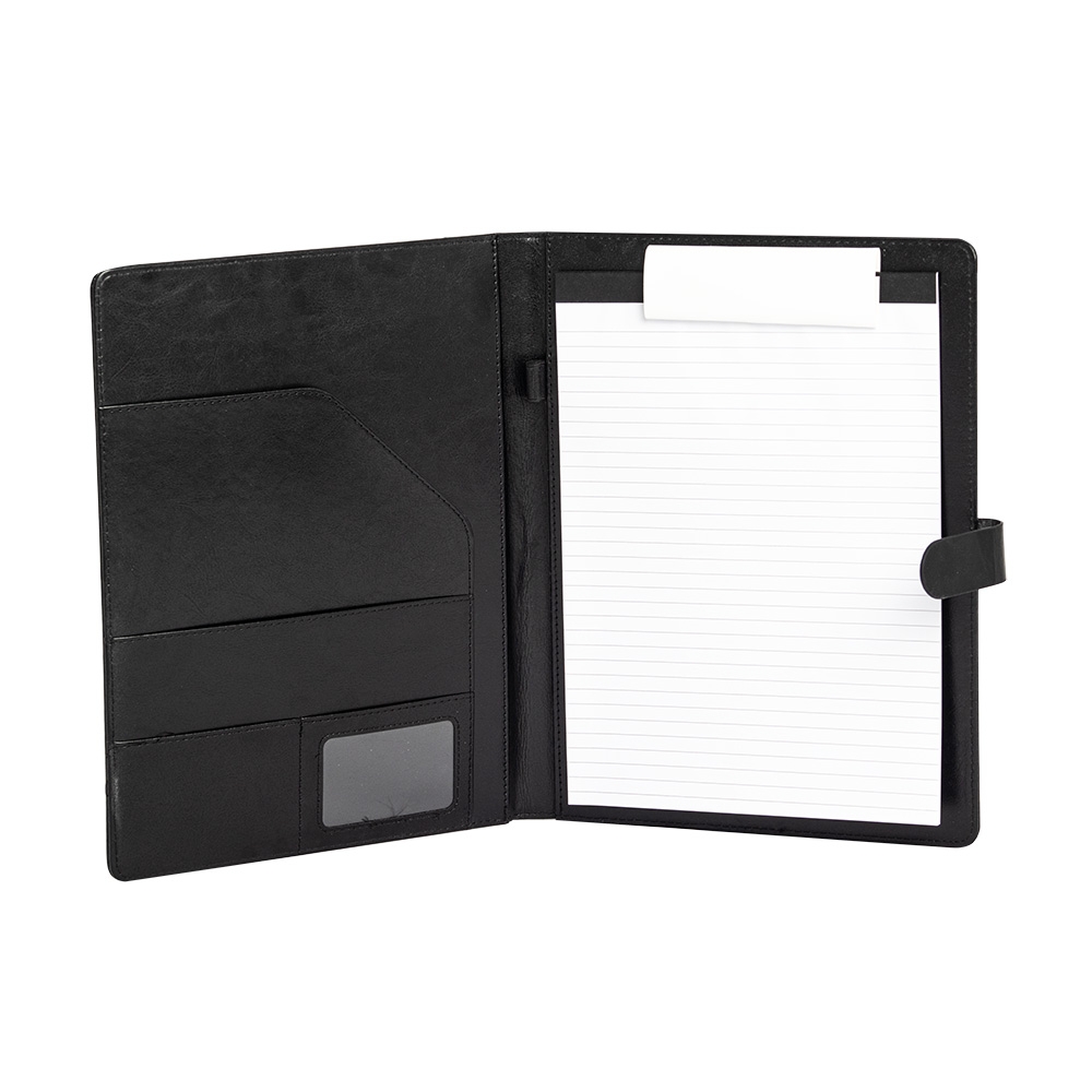 Descrição: Organização impecável com estilo profissional. Nossa pasta executiva, feita em couro sintético de alta qualidade, acompanha um bloco de aproximadamente 20 folhas pautadas removíveis para anotações, suporte para caneta, bolsos para organizar folhas ou documentos, suporte para cartões, incluindo um com visor de identificação. Além disso, possui fechamento magnético, unindo praticidade e elegância em um único produto.