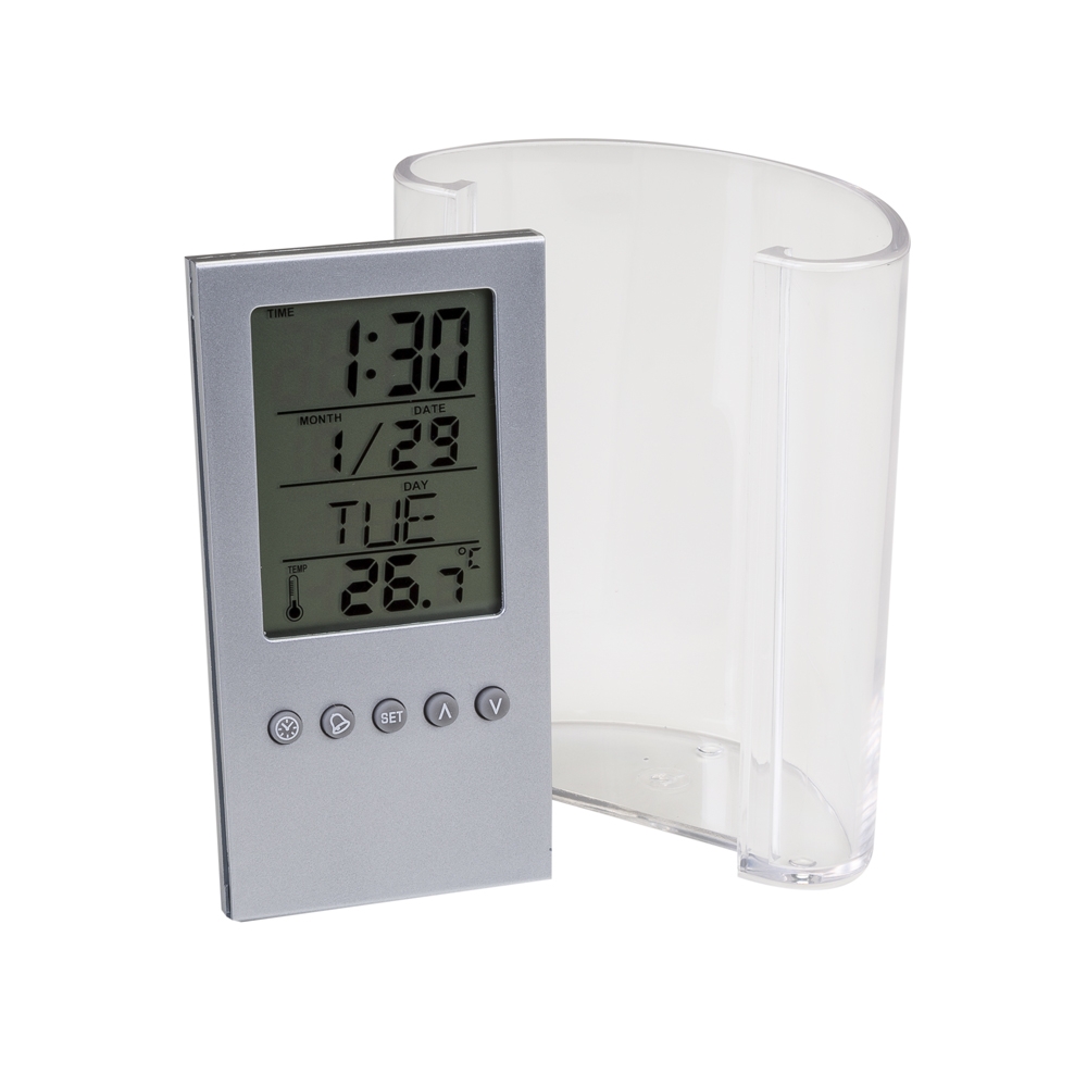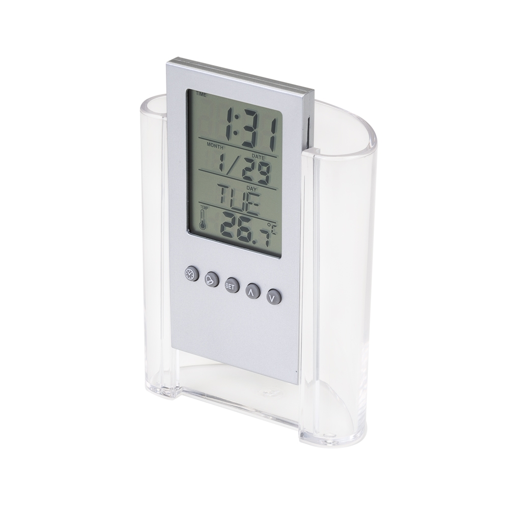Porta caneta acrílico com relógio plástico LCD(pode ser removido). Possui relógico plástico que pode ser removido. Fucionamento – Mode(desenho de um relógio): ao pressioná-lo poderá fazer alterações no sistema de visualização de horas(24hs ou AM/PM), alterações nas horas/minutos, ano, mês e data. Alarme(desenho de um sino): ao pressioná-lo poderá fazer alterações no alarme e toque do alarme. SET: altera o sistema de visualização de graus(Celsius ou Fahrenheit). Seta para cima: ativa o modo soneca. Seta para baixo: altera toques do alarme. Acompanha uma bateria CR2025.