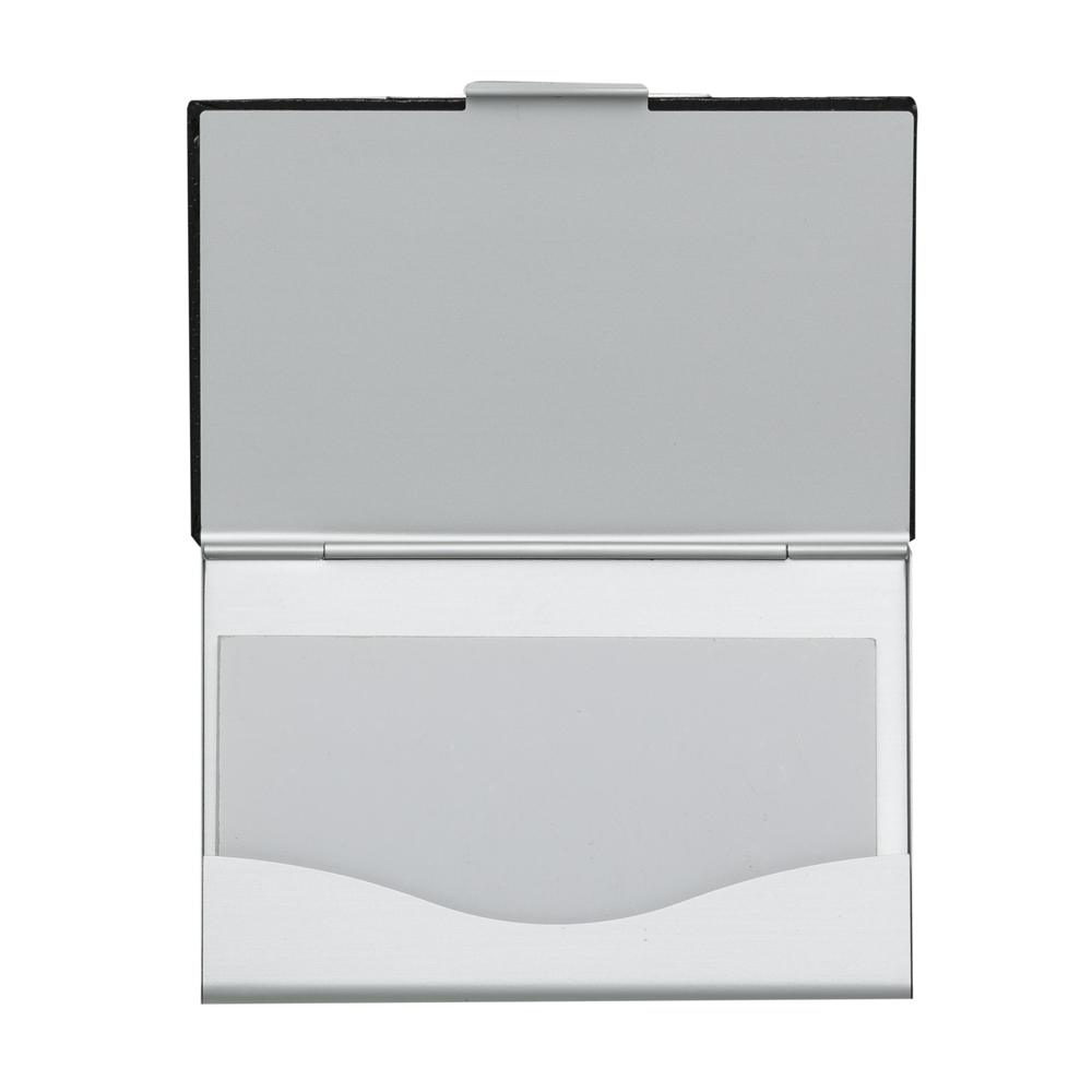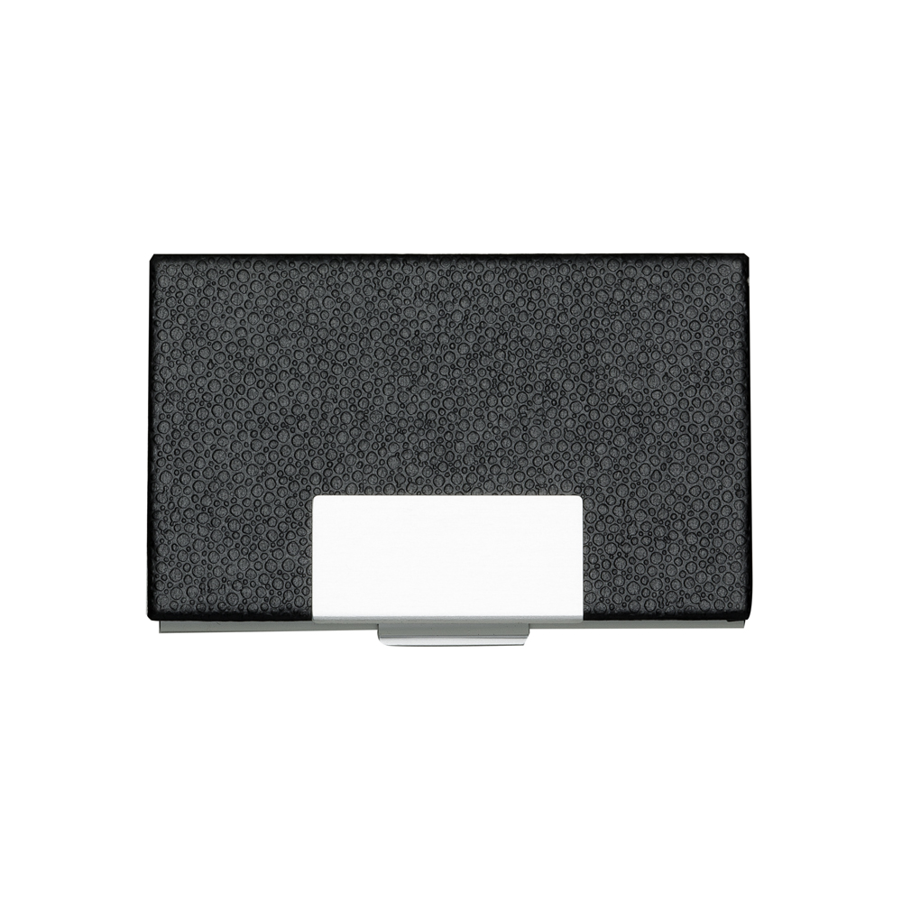 Porta cartão em material sintetico (imitação de couro) com detalhes em prata. Possui chapa central em metal para gravação, parte interna e traseira em alumínio.
