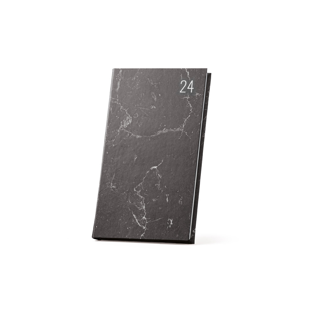 Agenda de bolso com capa rígida em papel pedra e marcador em fita, com aspeto mármore e cantos retos. Está organizada num plano bissemanal. 85 x 145 mm