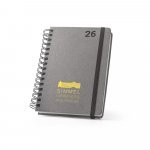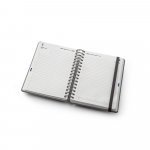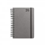 Agenda A5, com argolas, em pele (58% reciclada). Possui um elástico para fecho da agenda. Está organizada num plano diário. 148 x 210 mm