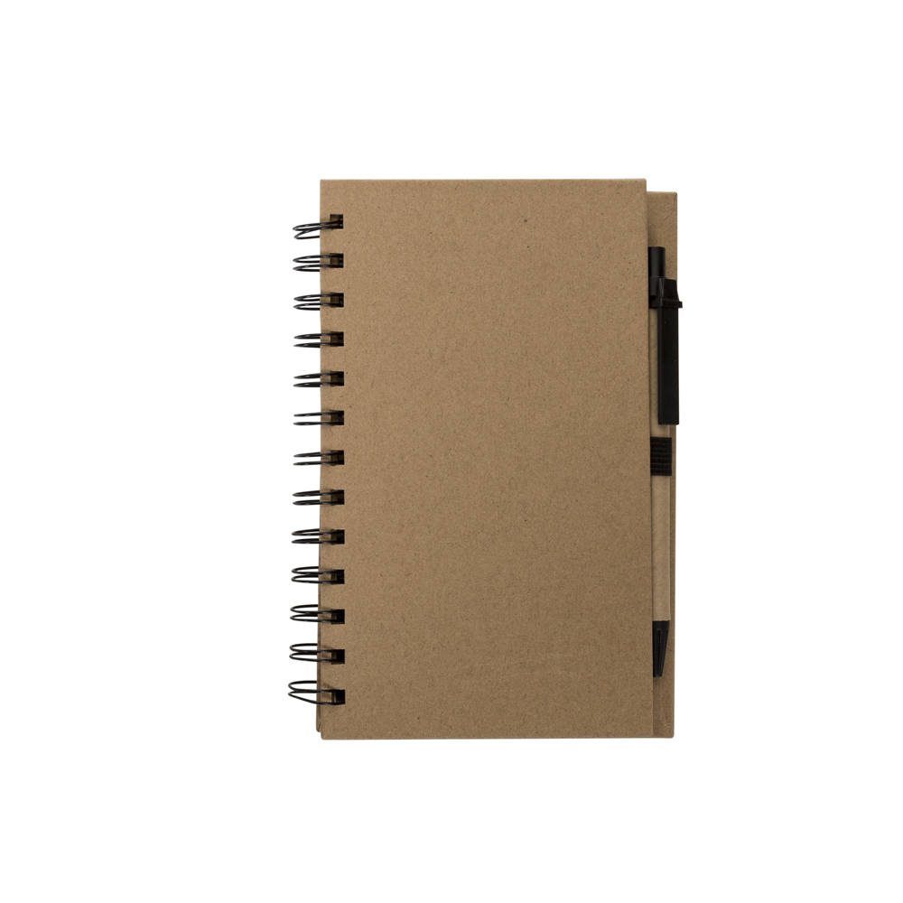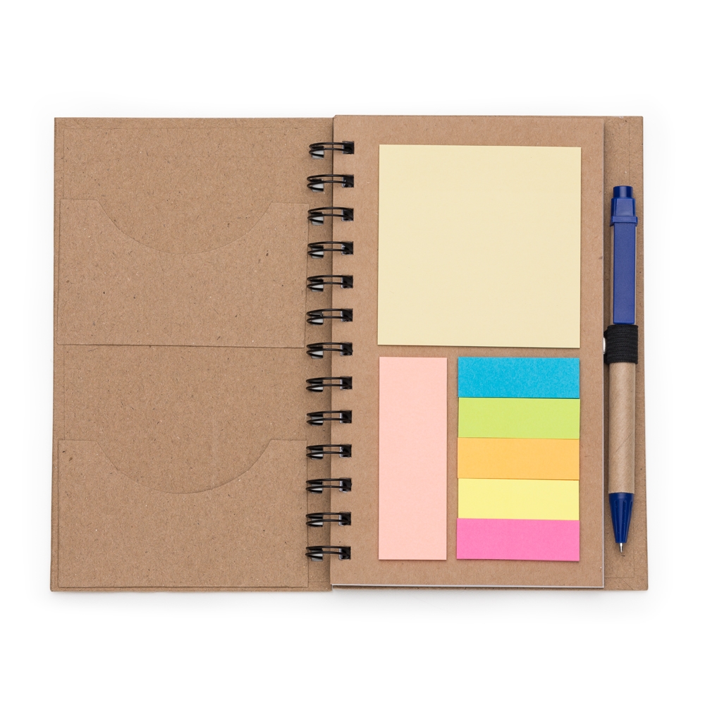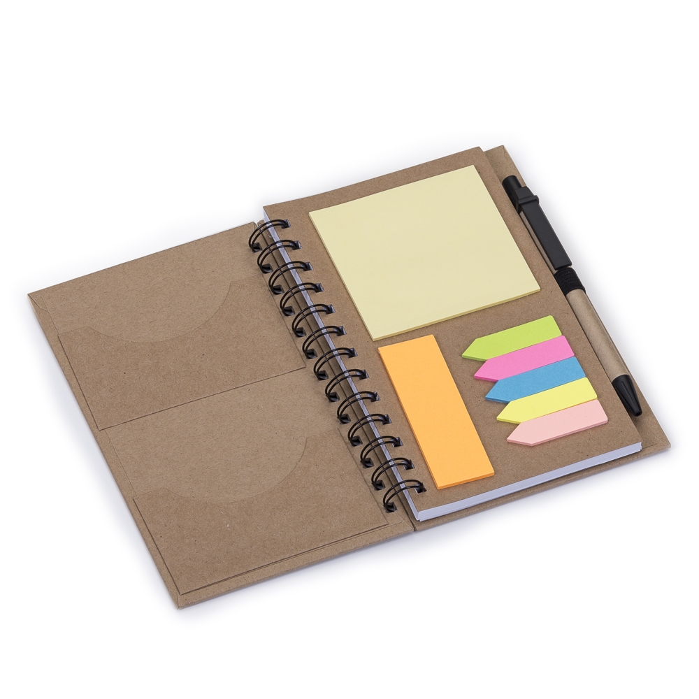Bloco de anotações ecológico com caneta e post-it. Bloco com dois suporte internos para cartão, possui cinco blocos auto-colantes com 20 folhas cada, bloco laranja e bloco amarelo com aproximadamente 20 folhas cada. Possui aproximadamente 70 folhas brancas pautadas e caneta de papelão de clip e ponteira plástica.