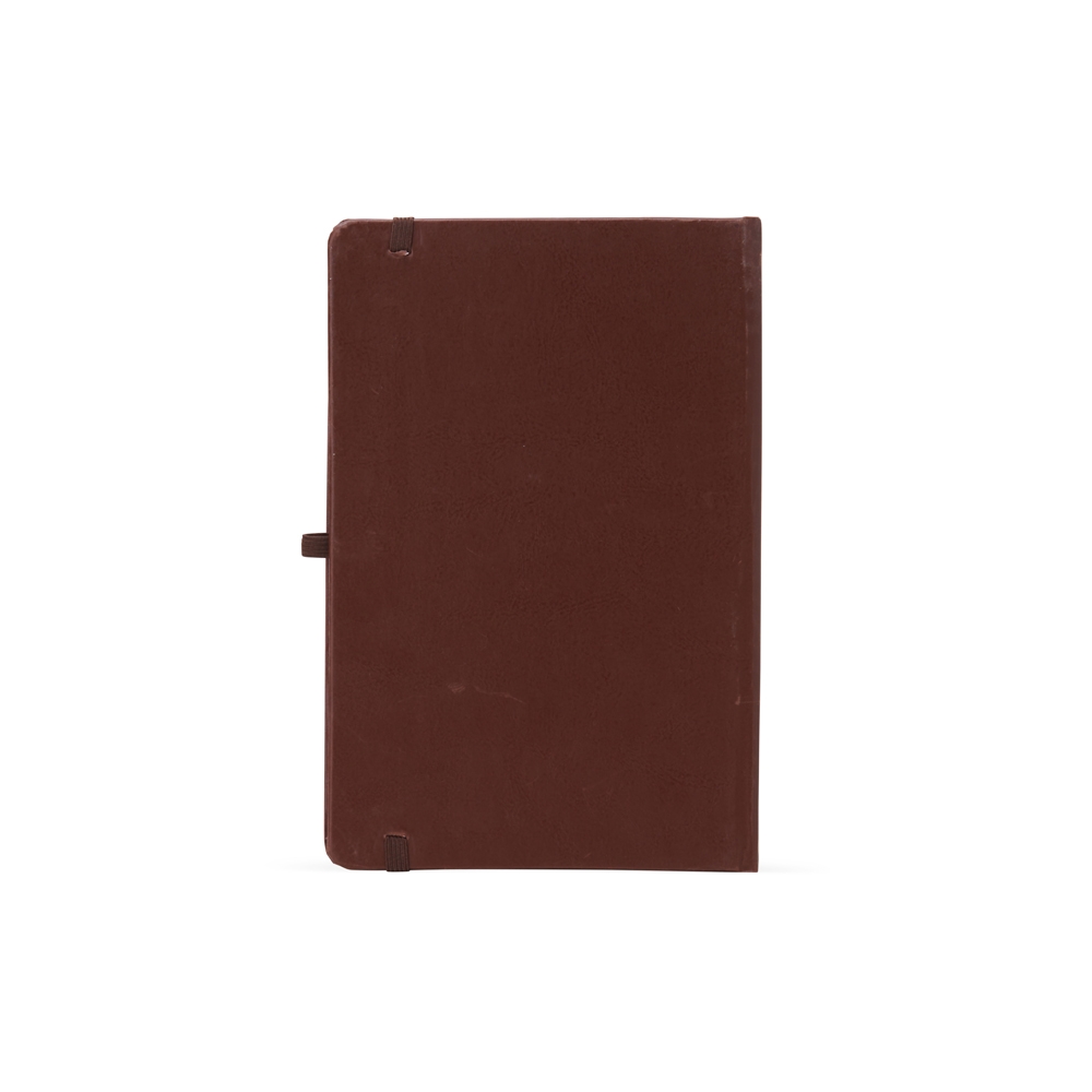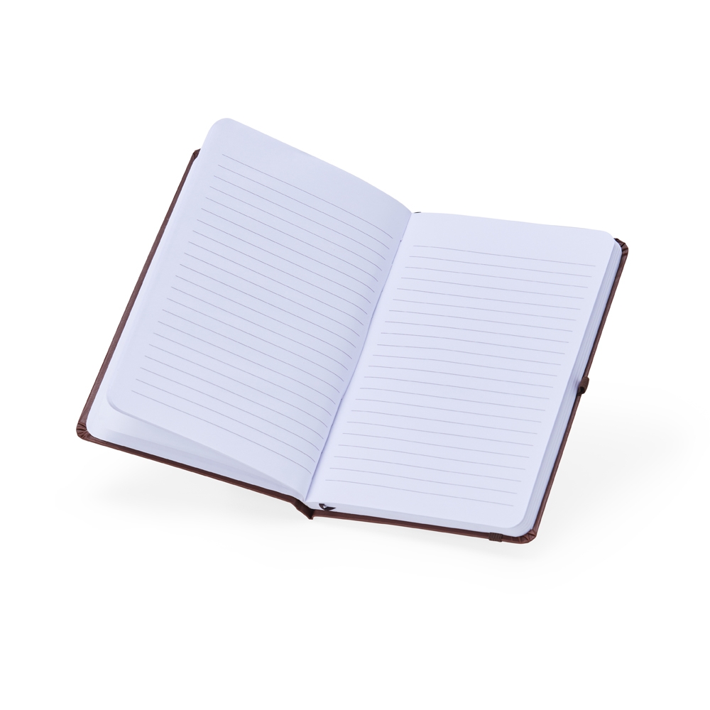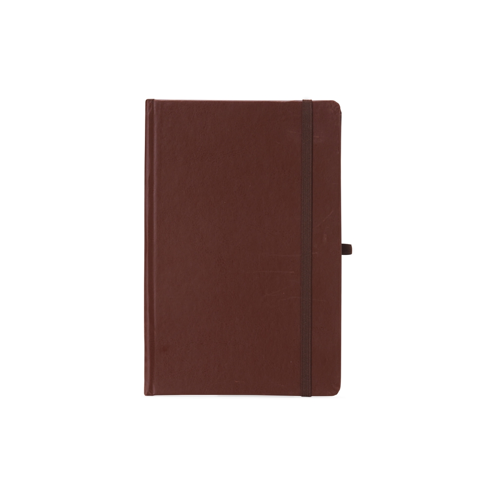 Descrição: Caderneta de material sintético (imitação de couro) com suporte para caneta, elástico para lacre e marcador de página em cetim, contém aproximadamente 80 folhas com pauta na cor branca.
