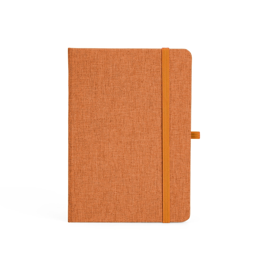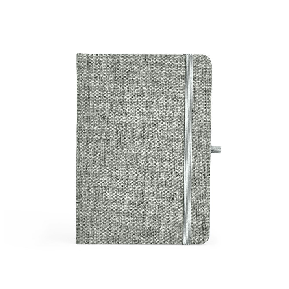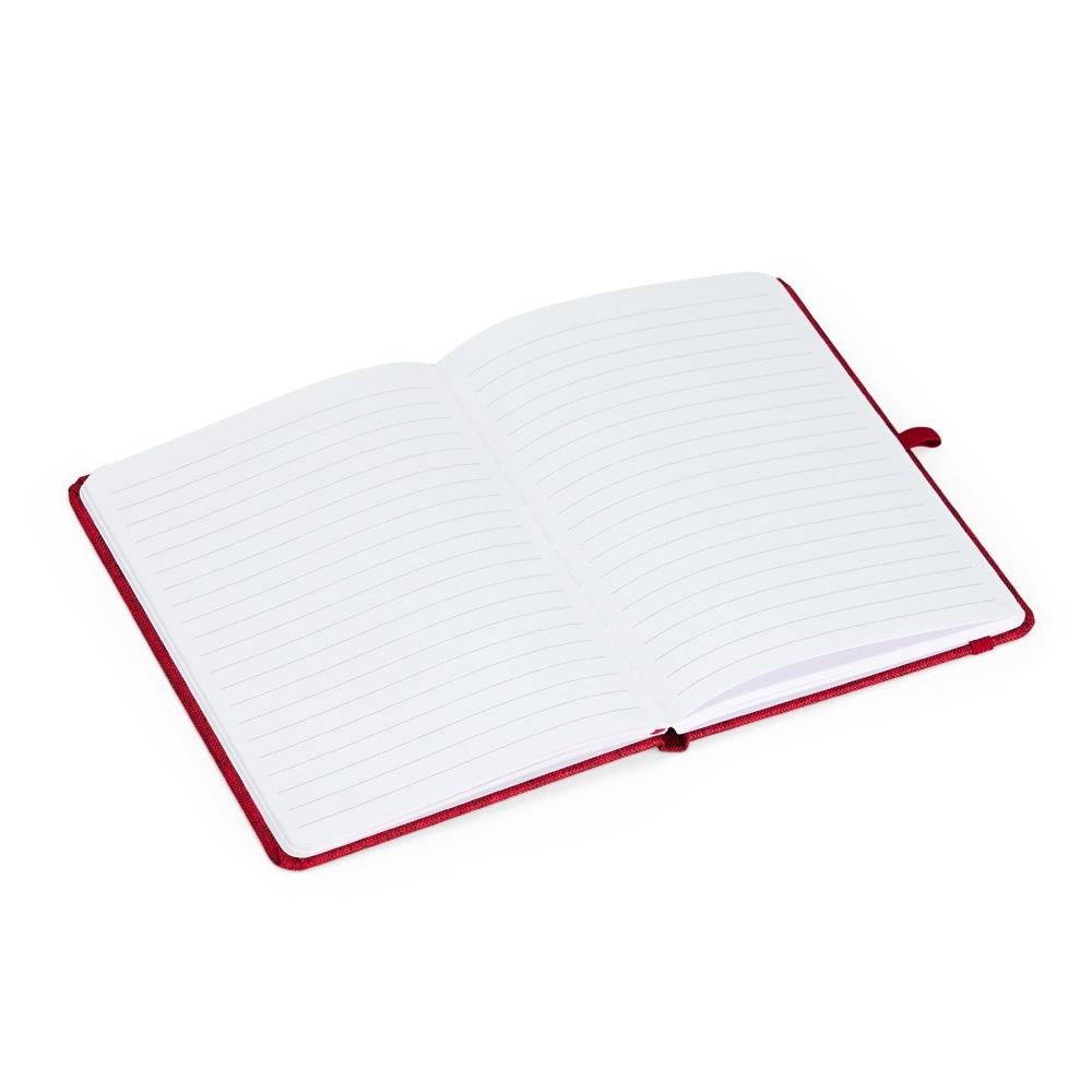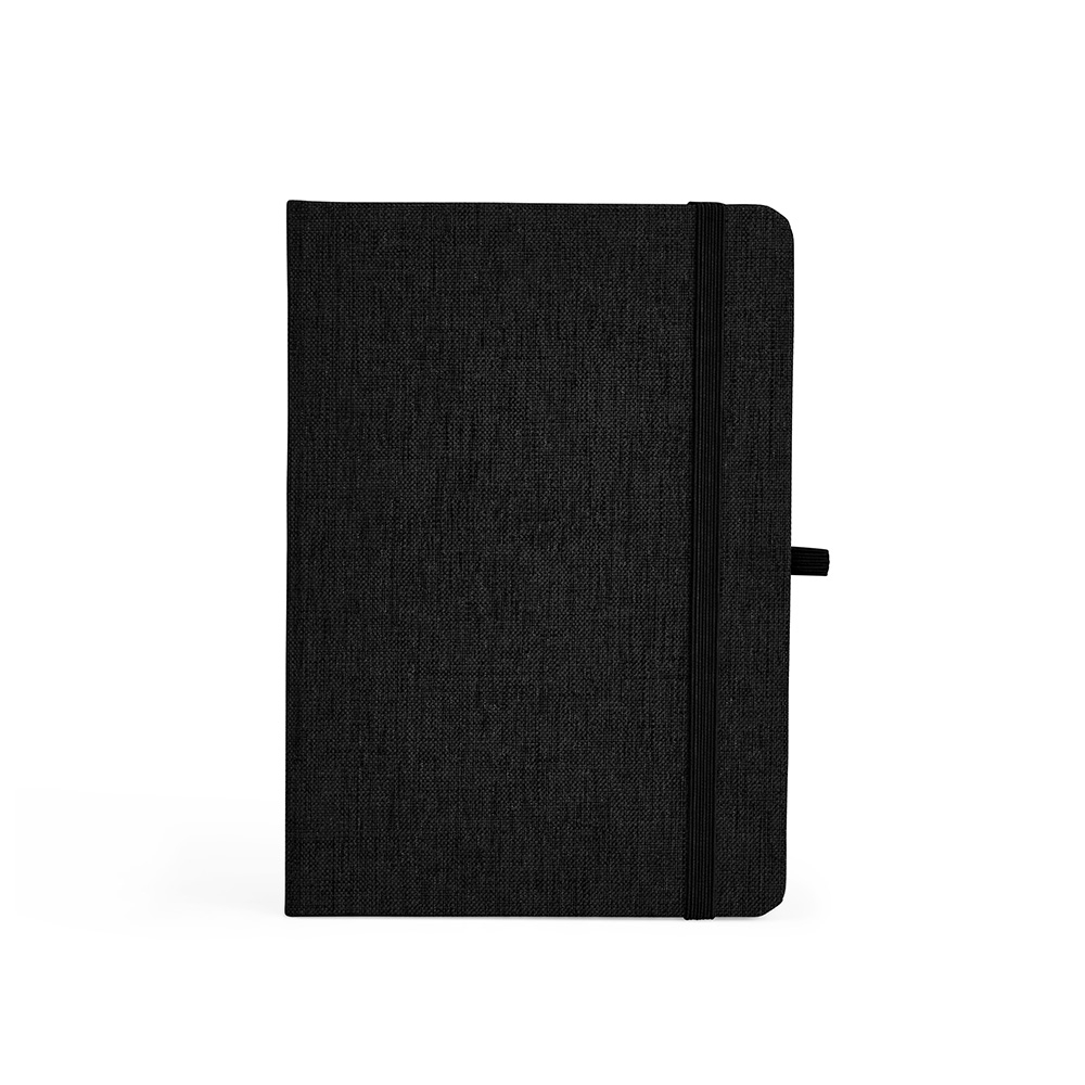 Descrição: Caderneta feita de linho com porta caneta elástico, marcador de página em cetim e fita elástica para fechar. Contém aproximadamente 80 folhas brancas pautadas.