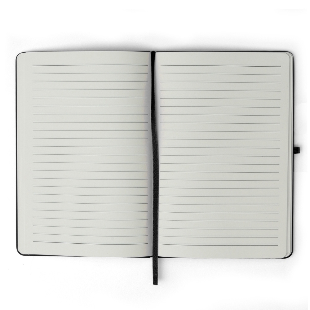 Caderneta tipo Moleskine emborrachado com porta caneta elástico em nylon, marcador de página em cetim e fita elástica de nylon para fechar. Contém aproximadamente 80 folhas pardas pautadas.