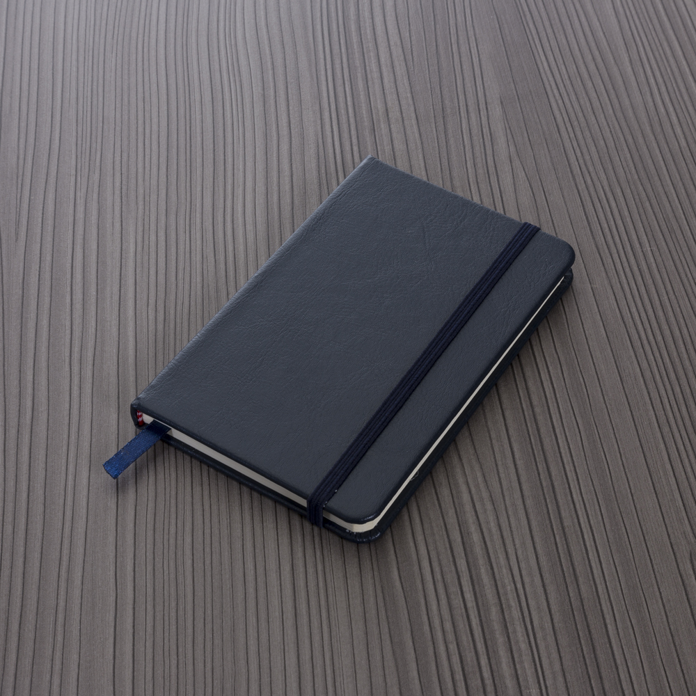 Caderneta tipo Moleskine com elástico para lacre e marcador de página em cetim.