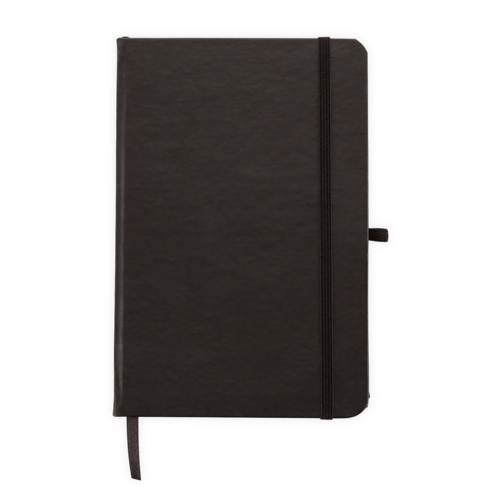 Caderneta tipo moleskine em percalux, marcador de página em cetim e suporte elástico para caneta (não acompanha). Contém aproximadamente 79 folhas pardas com pauta.