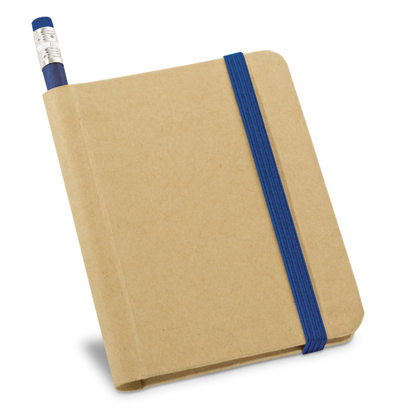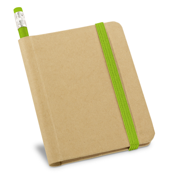 Caderno. Cartão. Capa dura. Com 70 folhas não pautadas de papel reciclado. Incluso lápis. 82 x 105 mm