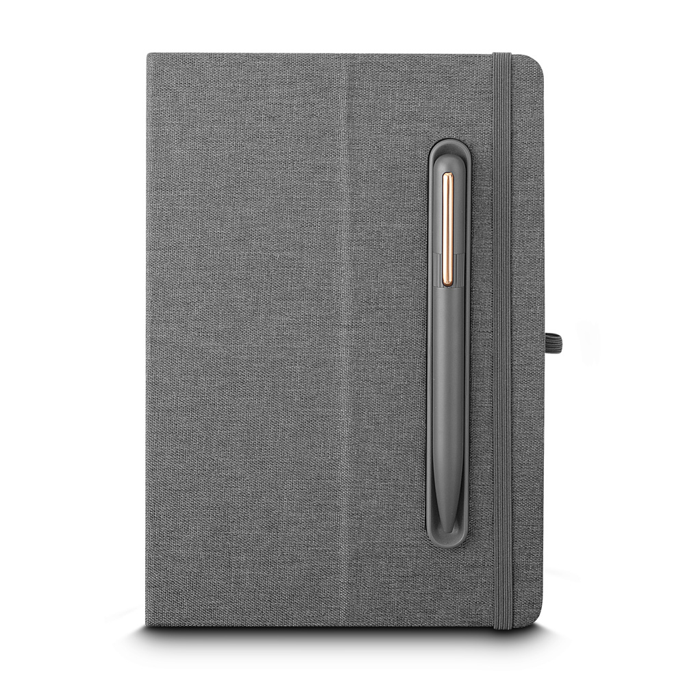 Caderno produzido com capa em tecido RPET e suporte para caneta, capa dobrável para suporte de smartphone, miolo com 80 folhas pautadas.
